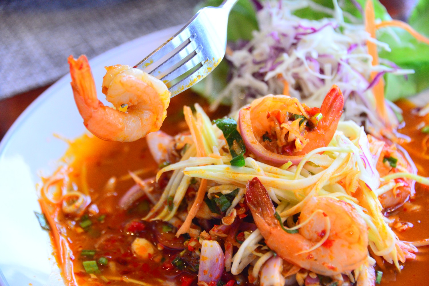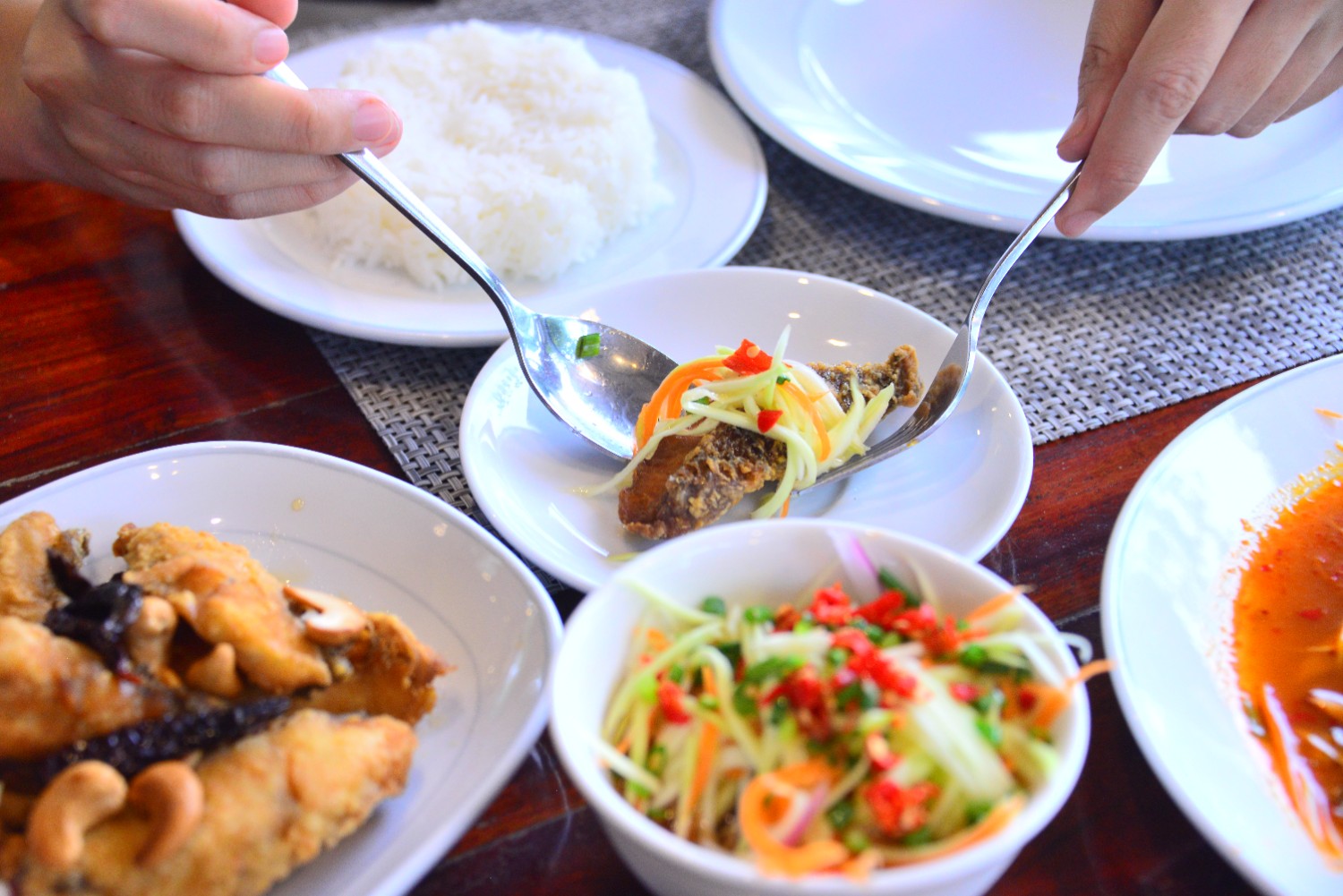 นี่ค่ะ แค่สีสันอาหารก็สดใสแทนแสงแดดวันนี้ไปแล้ว สั่งมา 4 อย่าง มีพล่ากุ้ง - กุ้งผัดพริกเกลือ - ไข่เจียวปู - เนื้อปลากะพงราดน้ำปลา เสิร์ฟพร้อมยำมะม่วง