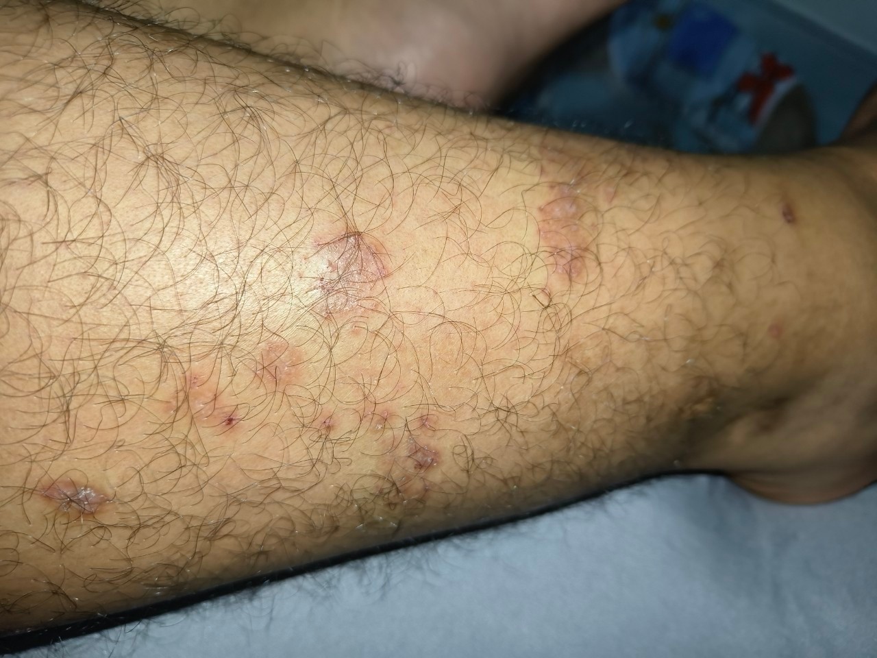 มีผื่นแบบนี้ขึ้นบริเวณขา มีอาการคันบ้าง บางวันเหมือเห่อแดงขึ้นมา บางวันก็มีแค่ตุ่มที่แห้ง และมีผื่นตุ่มใสขึ้นบริเวณหน้าท้อง ไม่มีอาการคัน เป็นแบบนี้เกิดจากผิวหนังอักเสบหรือเปล่าครับ ใครพอมียาทาแนะนำไหมครับ