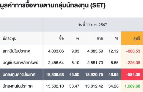 Sinthorn Summary 11/7/2567 : ต่างชาติขายสุทธิ -584.06 ลบ.