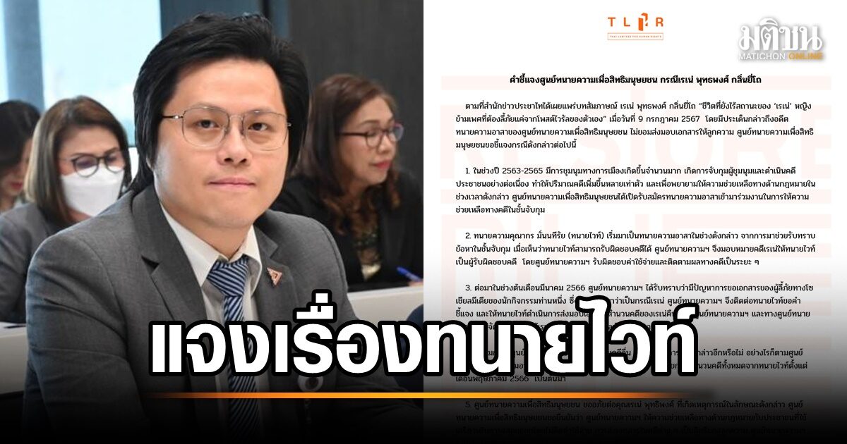 ตามที่สำนักข่าวประชาไทได้เผยแพร่บทสัมภาษณ์ เรเน่ พุทธพงศ์ กลิ่นยี่โถ ชื่อ “ชีวิตที่ยังไร้สถานะของ ‘เรเน่’ หญิงข้ามเพศที่ต้องลี้ภัยแค่จากโพสต์ไวรัลของตัวเอง” เมื่อวันที่ 9 กรกฎาคม 2567 โดยมีประเด็นกล่าวถึงอดีตทนายความอาสาของศูนย์ทนายความเพื่อสิทธิมนุษยชน ไม่ยอมส่งมอบเอกสารให้ลูกความ ศูนย์ทนายความเพื่อสิทธิมนุษยชนขอชี้แจงกรณีดังกล่าวต่อไปนี้