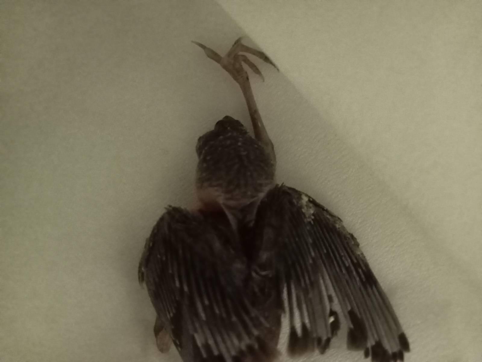 พอดีช่วงบ่ายเราเปิดผ้าม่านตรงระเบียงออก แล้วเห็นลูกนกนอนดิ้นหงายท้องอยู่ตรงพื้นระเบียงน่ะค่ะ เลยไปตัดเศษผ้ามาเพื่อห่อตัว แล้วพยายามพลิกให้มันนอนคว่ำปกติ และคิดว่ามันคงหิวมากเพราะมันอ้าปากตลอดเลย เรากั