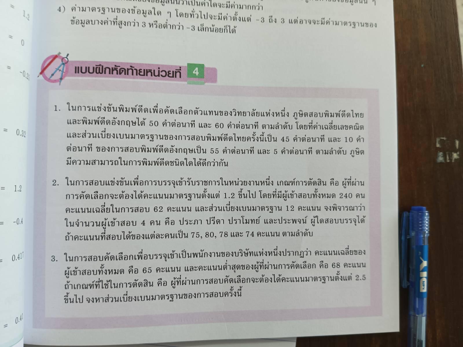2. ในการสอบแข่งขันเพื่อการบรรจุเข้ารับราชการในหน่วยงานหนึ่ง เกณฑ์การตัดสิน คือ ผู้ที่ผ่าน การคัดเลือกจะต้องได้คะแนนมาตรฐานตั้งแต่ 1.2 ขึ้นไป โดยที่มีผู้เข้าสอบทั้งหมด 240 คน คะแนนเฉลี่ยในการสอบ 62 คะแนน และส่วนเบี่ยงเบนมาตรฐาน 12 คะแนน จงพิจารณาว่า ในจำนวนผู้เข้าสอบ 4 คน คือ ประภา ปรีดา ปราโมทย์ และประพจน์ ผู้ใดสอบบรรจุได้ ถ้าคะแนนที่สอบได้ของแต่ละคนเป็น 75, 80, 78 และ 74 คะแนน ตามลำดับ