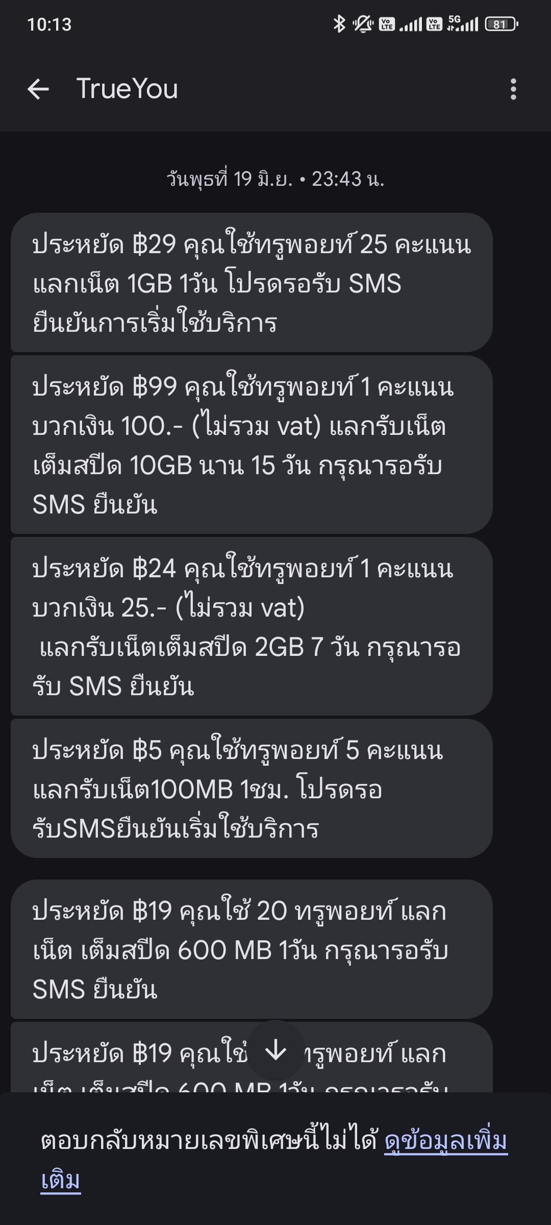 ปกติใช้เน็ตเติมเงินรายเดือน 30 Mbps ไม่อั้นไม่ลดสปีดนาน 30 วันอยู่ แต่วันที่ 7-7-68 เวลา 02.12น. กลับมีข้อความมีแพ็กเกจเน็ตเต็มสปีด 4 GB 1 วัน ราคา 20 บาทต่ออายุอัตโนมัติเข้ามา และหักเงินที่เติมไว้ขอ