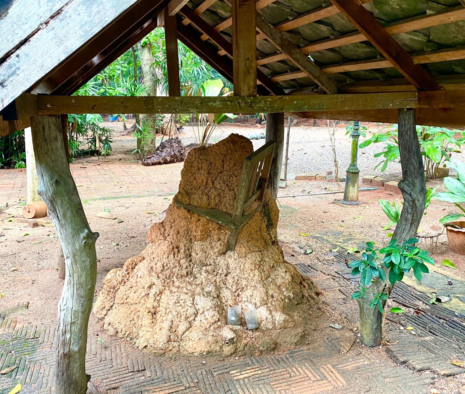 เมื่อไปเยี่ยมบ้านคุณแม่ถ้วนที่ตรัง ก็ประทับใจในพื้นที่อันร่มรื่นไปด้วยต้นไม้น้อยใหญ่และชอบใจเป็นพิเศษในความใจดีของเจ้าของบ้านที่สร้าง เพิงเล็กๆมีหลังคาคลุมจอมปลวกใหญ่ในสวน เมตตาขนานแท้เลยนะเนี่ย! จอมปลวกนี้ขึ้นบนเก้าอี้ที่คุณชวนเคยนั่งทำงาน ท่านเก็บไว้เป็นอนุสรณ์ แต่พอดี โดนจอมปลวกบุก ท่านก็เลยสร้างหลังคาคลุมไว้เสียเลย