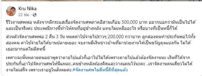 งานศพทางอิสานหมดเยอะเพราะคนมาช่วยงานเยอะ แม้ไม่ได้บอกไม่แจกซองเขาก็มาช่วยเพราะถือว่าทุกคนอยู่ในสังคมเดียวกันพึ่งพากัน