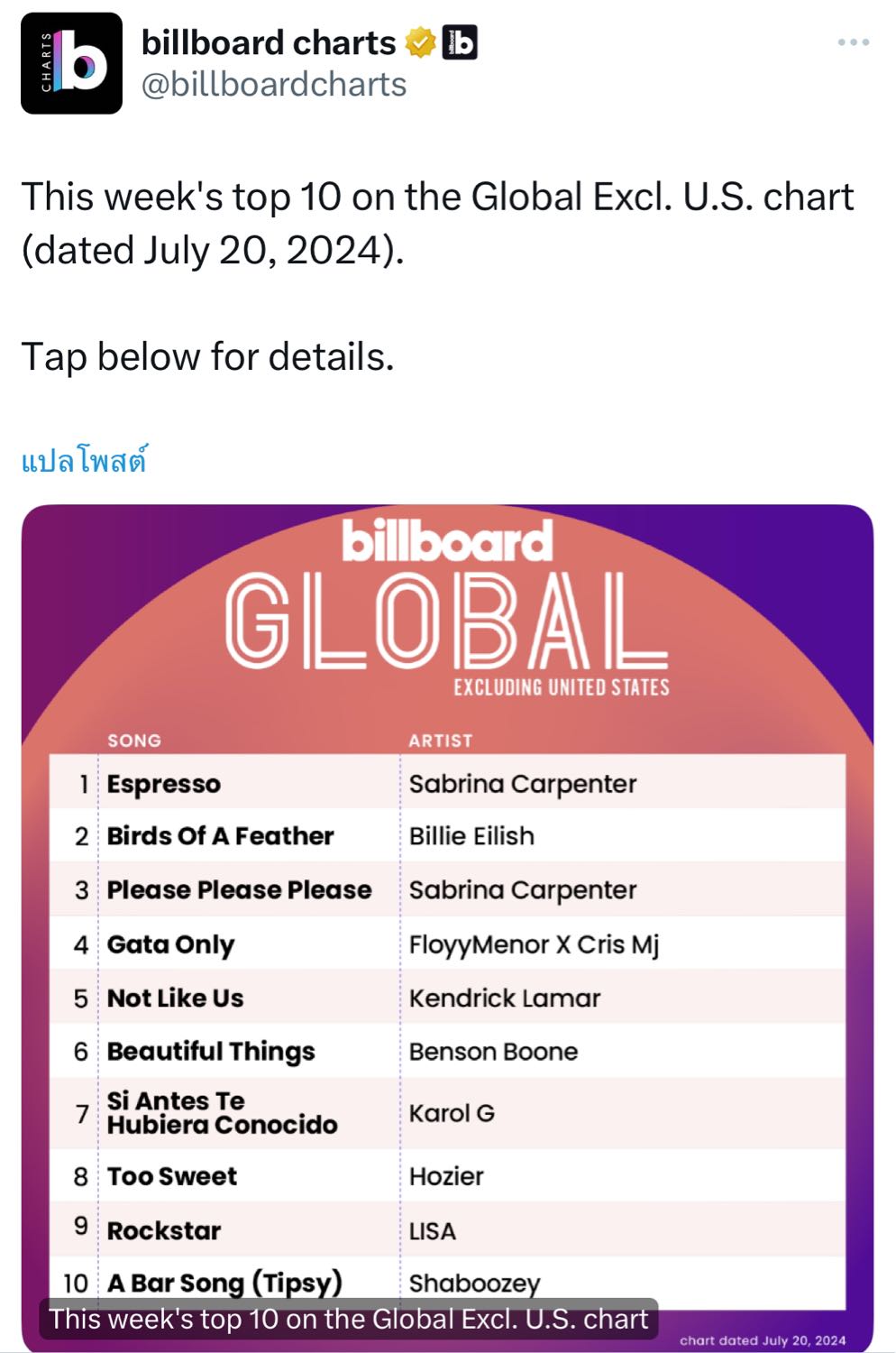 “Rockstar” by LISA อยู่ที่อันดับ 9 ใน Billboard Global Excl. US ประจำสัปดาห์นี้
