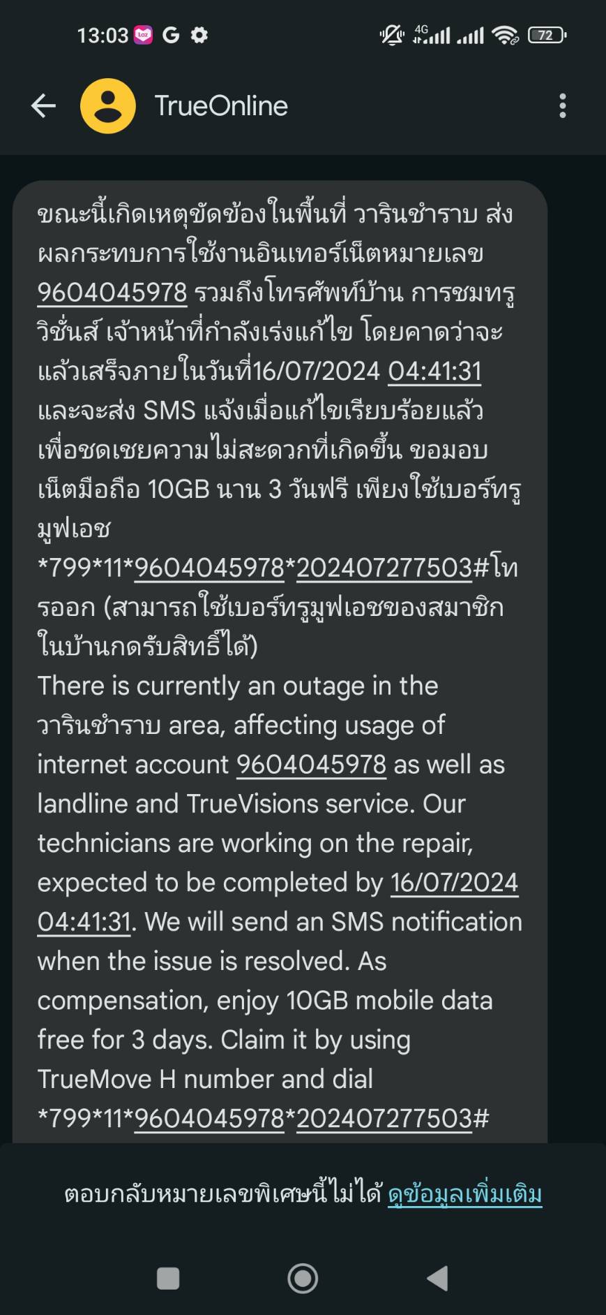 ได้รับข้อความ จากทรู ว่ามีเหตุขัดข้องทำให้งานใช้งานอินเตอร์เน็ตไม่ได้ ตั้งแต่วันที่ 15-07-2567