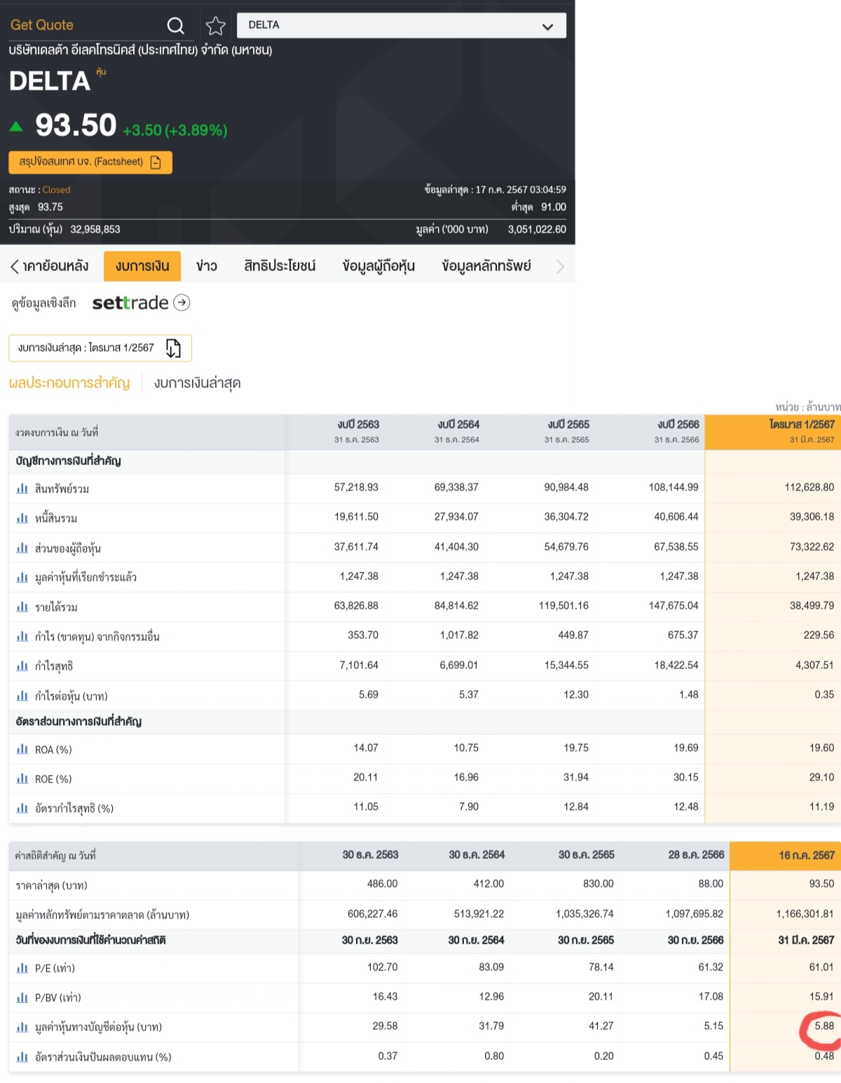 เมื่อวานอาแปะว่าจะซื้อ DELTA สักร้อยหุ้น พอเปิดมูลค่าทางบัญชีดู..เอ๊าาา แค่ 5 บาทเองเหรอะ...