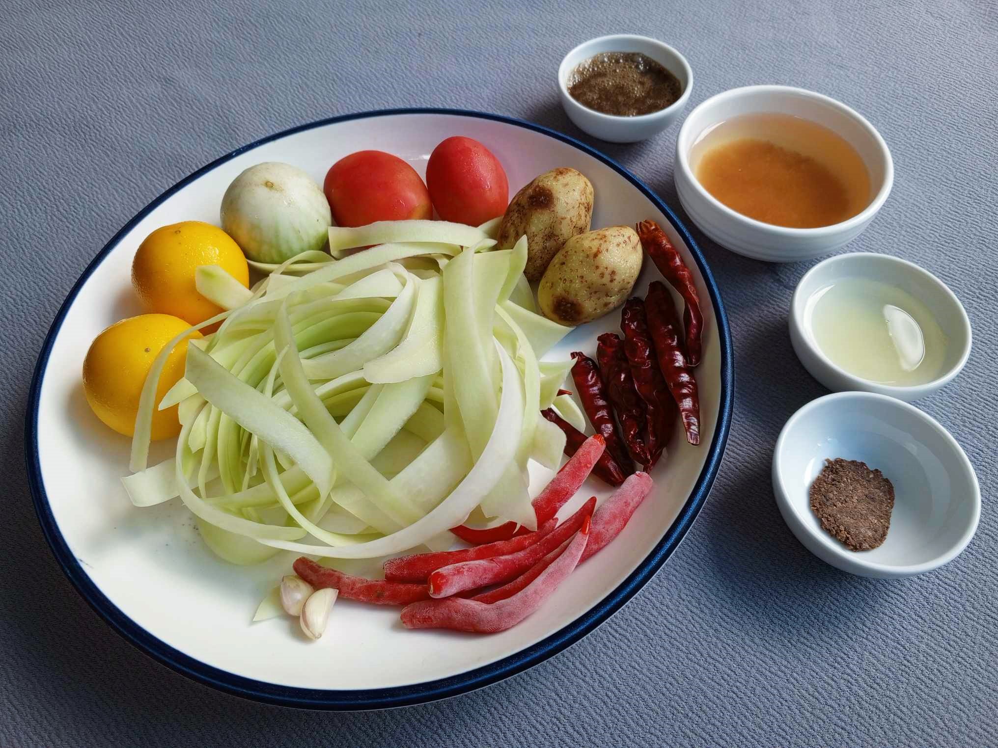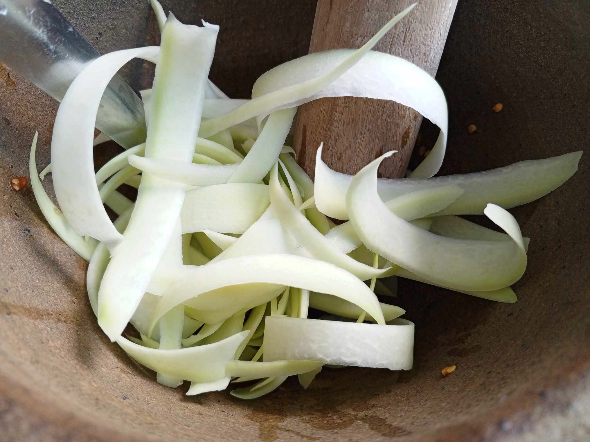 จริงๆได้รองท้องด้วยข้าวและนมมาแล้วนะคะ แต่อยากกินของแซ่บค่ะ เลยมาจบที่ส้มตำแล้วกัน แต่วันนี้อยากลองเปลี่ยนรสสัมผัสของเส้นมะละกอดูบ้าง นึกถึงตำหลวงพระบางขึ้นมา ก็เลยฝานมะละกอให้เป็นแผ่น เลียนแบบเขา (ปกติเราจะใช้การสับค่ะ)