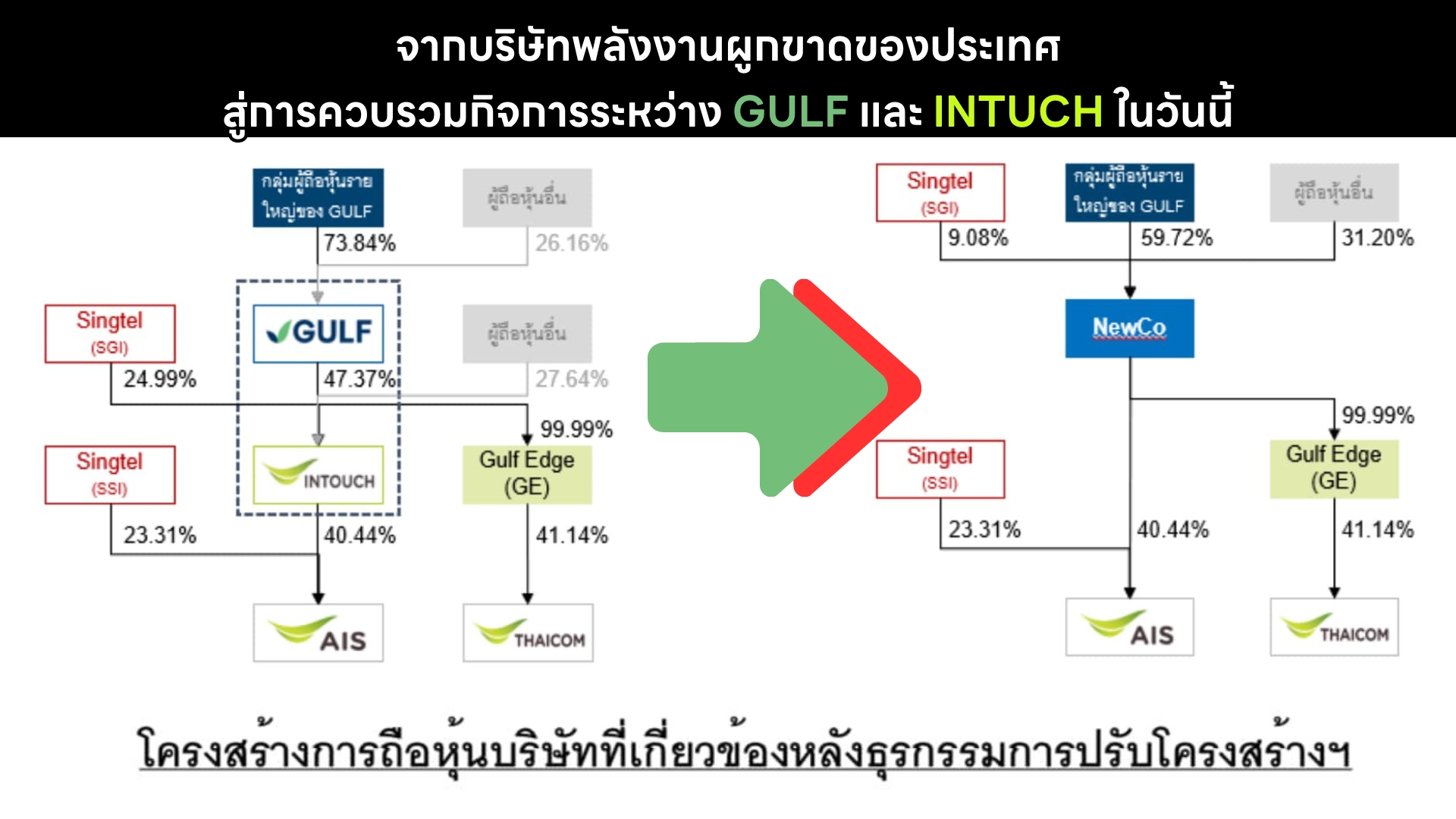 วงการตลาดหุ้นไทย บริษัท กัลฟ์ เอ็นเนอร์จี ดีเวลลอปเมนท์ จำกัด (มหาชน) (GULF) และบริษัท อินทัช โฮลดิ้งส์ จำกัด (มหาชน) (INTUCH) ประกาศควบรวมกิจการ จัดตั้งบริษัทใหม่ (NewCo) เหลือแค่บริษัทเดียวเท่านั้น