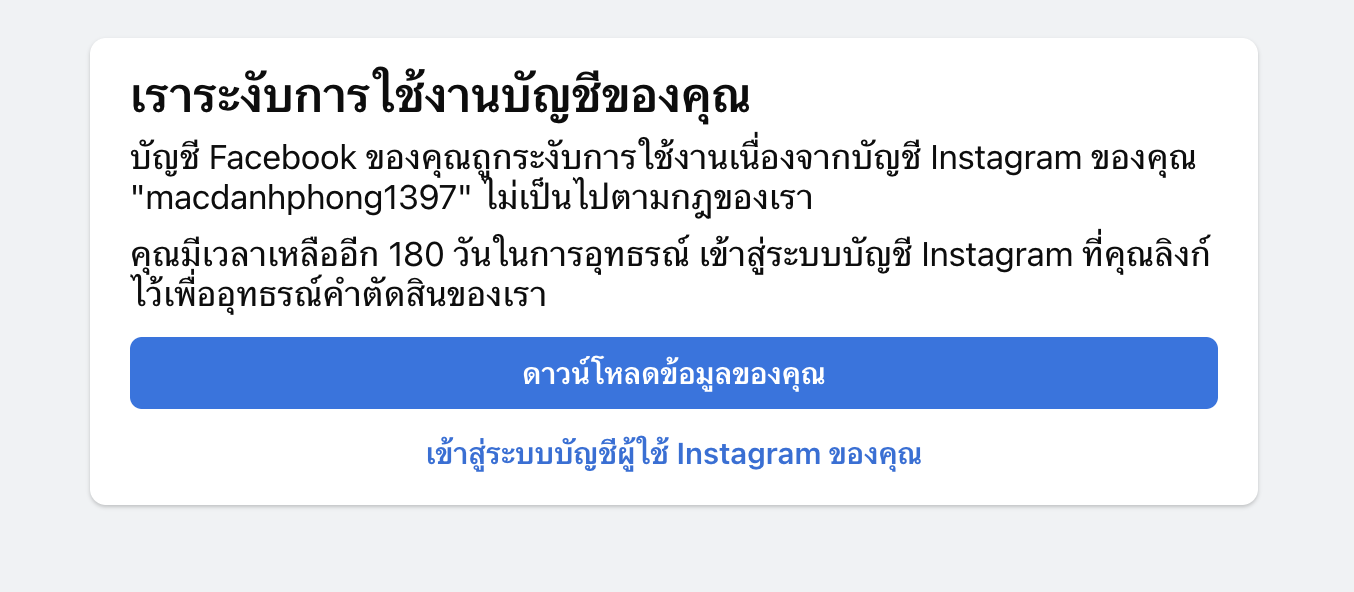 ขอความช่วยเหลือเกี่ยวกับบัญชี Facebook ของผมที่ถูกระงับโดยไม่ทราบสาเหตุ แต่ระบบแจ้ง "We've suspended your account" และให้เหตุผลว่าบัญชี instagram : macdanhphong1397 (ตามรูป) ไม่ได้ทำตามกฏชุมชน ซึ่งผมไม่ใช่เจ้าของบัญชีนี้ และบัญชีใครก็ไม่รู้