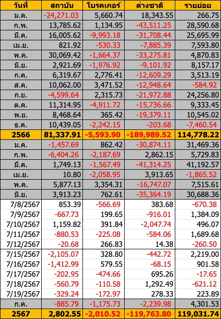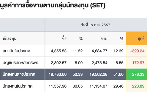 Sinthorn Summary 19/7/2567 : ต่างชาติซื้อสุทธิ 278.33 ลบ.