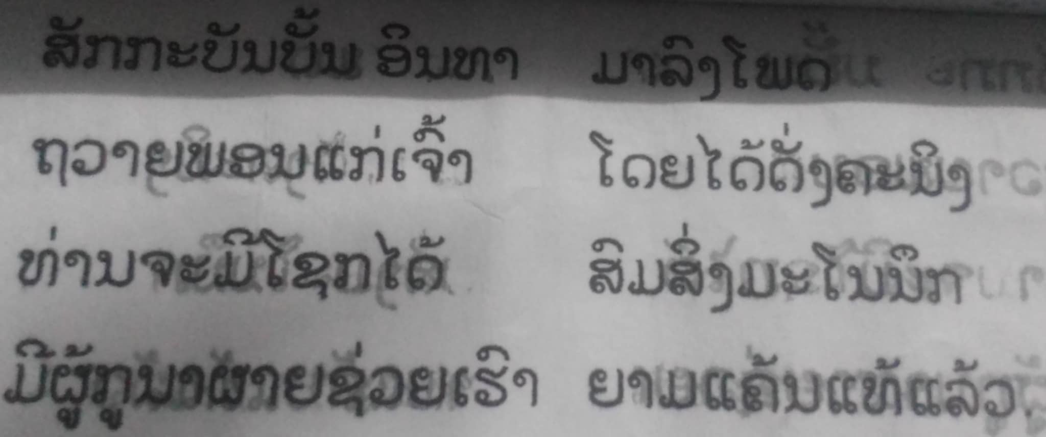 เมื่อประมาณช่วงต้นปีก่อนได้มีโอกาสไปไหว้พระธาตุศรีโคดตะบอง เมืองท่าแขก ประเทศลาว เลยลองเสี่ยงเซียมซีดู จนจับฉลากออกมาได้เป็นบทกลอนประมาณนี้ แต่ก็ยังไม่ค่อยเข้าใจความหมายสักเท่าไร เลยอยากจะสอบถามมายังผู้เชี่ยวชาญทางด้านภาษาลาว ช่วยแปลความหมายของบทกลอนนี้ให้ด้วยครับ