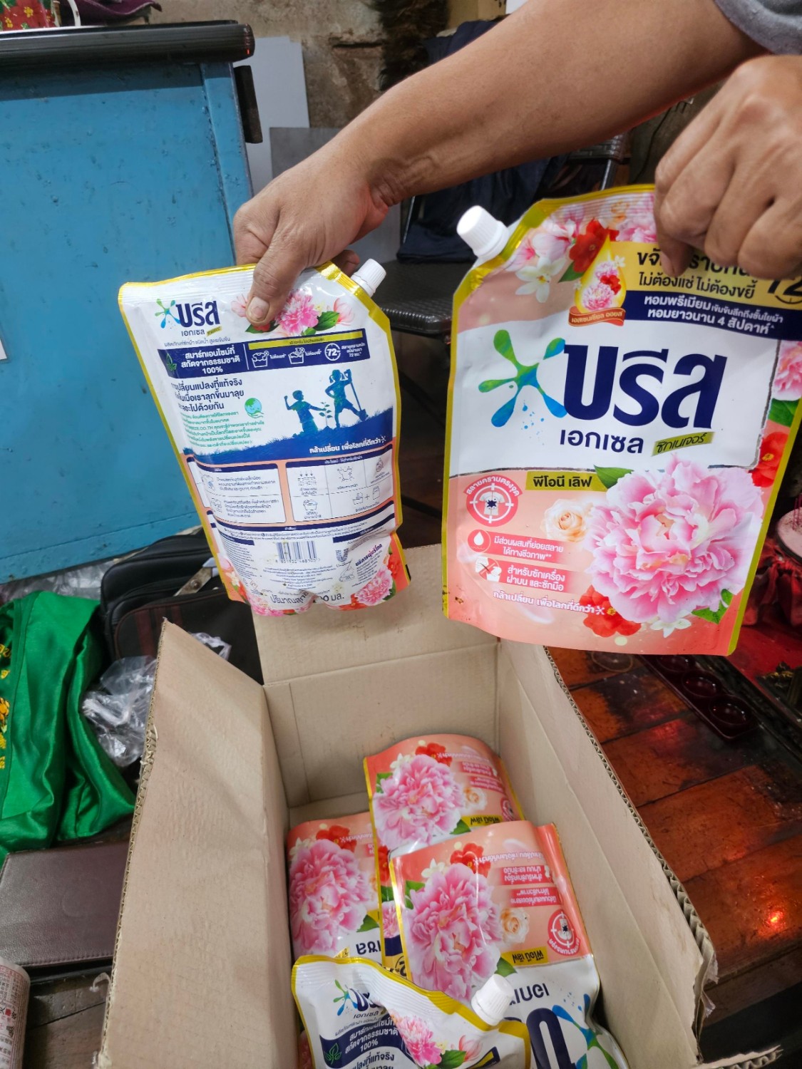เห็นความแตกต่างชัดเจนมากจากในรูปคือถุงที่แตกไปคือน้ำยาไหลออกแทบไม่เหลือเลย ทางขนส่งได้มีการแกะเปลี่ยนกล่องก่อนเอามานำมาส่งด้วย
