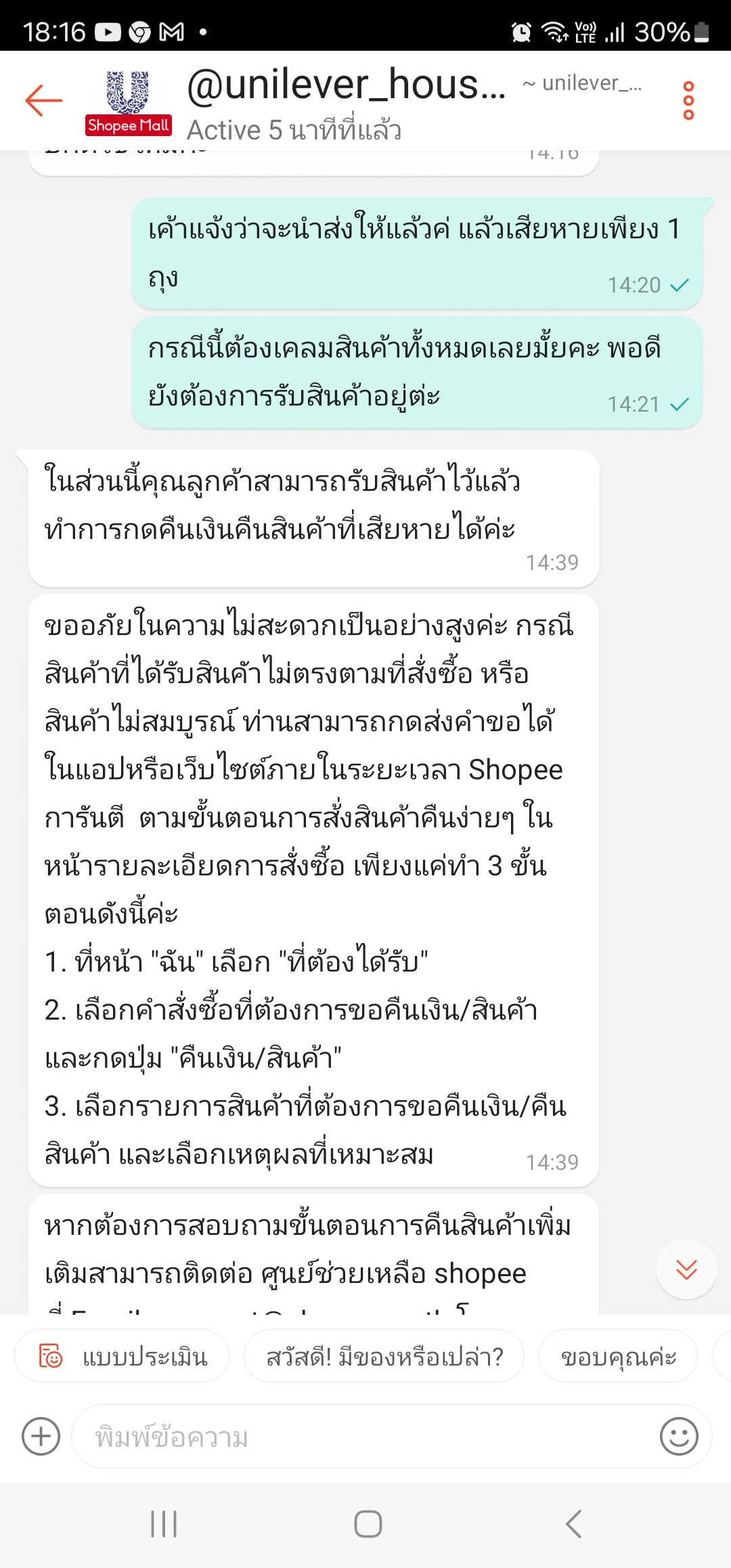 เราได้ทำการสั่งซื้อสินค้ากับทาง Uniliver_householdcare ใน Shopee Mall เมื่อวันที่ 15/7/67 เพราะเห็นว่าลดราคาเยอะดี เลยสั่งซื้อไปจำนวน 2 รายการ คือ 1 . ตัว Breeze Colour Catcher จำนวน 1 รายการ และ 2. น้ำยาซักผ้า Breeze กลิ่นพีโอนีเลิฟ จำนวน 6 ถุง หลังจากนั้นของดำเนินการจัดส่งมาถึงบ้านในวันที่ 18/7/67 ซึ่งถือว่าไม่ช้าแต่ว่าของมาถึงแค่ 1 รายการคือ ตัว Breeze Colour Catcher ส่วนอีก 1 รายการยังมาไม่ถึงแต่งานถูกปิดจบไปแล้วซึ่งเราไม่ได้รับของ ขนส่งไม่มีการติดต่อแจ้งเราแต่อย่างใด พอเราขอความช่วยเหลือไปทางแอดมิน Uniliver ก็แจ้งว่าจะดำเนินการตรวจสอบให้แต่เรื่องก็ไม่คืบหน้าเราต้องทำการตามกับทางขนส่งเองปรากฏว่าน้ำยาซักผ้าที่เราสั่งไปเกอดความเสียหายแตกหกออกมาเกือบหมดถุงเลอะท่วมไปทั้งกล่อง ซึ่งตรงนี้เราก็ต้องยอมรับว่าขนส่งก็มีส่วนผิดที่ไม่แจ้งกลับทางเราว่าเกิดอะไรขึ้นต่อจากนั้นเราได้มีการทักหาแอดมิน Uniliver ใน Shopee Mall สินค้ามีความเสียหายจำนวน 1 ถุง เราสามารถรับสินค้าในส่วนที่ไม่เสียหายและของเคลทสินค้าเฉพาะในส่วนที่เสียหายได้หรือไม่ ทางแอดมิทแจ้งว่าสามารถรับสินค้าและเคลมในส่วนที่เสียหายได้เราจึงรับสินค้าไว้และทำเรื่องขอเคลมสินค้า หลังจากนั้นพอระบบ Shopee ดำเนินการรับเรื่องแล้วปรากฎว่าเราต้องทำการคืนสินค้าทั้งหมด ซึ่งตอนแรกแอดมินคนแรกแจ้งว่าสามารถุดำเนินการได้เราจึงทักไปหาแอดมินอีก ปรากฎว่าแอดมินคนที่ 2 บอกเราว่าไม่สามารถดำเนินการคืนสินค้าบางส่วนได้เนื่องจากสินค้าเป็นเซท เราเลยบอกไปว่าตอนแรกไม่ได้แจ้งลูกค้าแบบนี้นี่คะ ทางนั้นก็ยืนยันจะให้เราคืนสินค้าทั้งหมดซึ่งมันเสียเวลามากๆ ถ้าเค้าแจ้งเราตั้งแต่แรกเราจะไม่รับสินค้าไว้ ถึงแม้ว่าระบบใน Shopee จะมีการส่งเคลมคืนสินค้า 2 แบบคือเราไปคืนเองกับเรียกขนส่งมารับ แต่คือเราไม่สะดวกจริงๆ ช่องทางแรก เราไม่ได้อยู่บ้านทุกวันเราต้องออกไปทำงานข้างนอกและเราไม่ได้ขับรถไปทำงานเราจะแบกสินค้าไปเคลมยังไง ช่องทางที่ 2 เรียกขนส่งมารับเราก้ต้องวุ่นวายออกไปหาร้านปริ้นเอกสารมาแปะหน้าให้ขนส่งต้องแพ็คให้ใหม่ ทั้งๆที่ความเป็นจริงถ้าแอดมินแจ้งรายละเอียดให้ชัดเจนตั้งแต่แรกก็จะไม่เป็นแบบนี้ อีกอย่างถ้าทางคลังสินค้าแพ็คของโดยใส่กันกระแทกมาให้สักนิดก็จะไม่ไเกิดเหตุการณ์แบบนี้ขึ้น