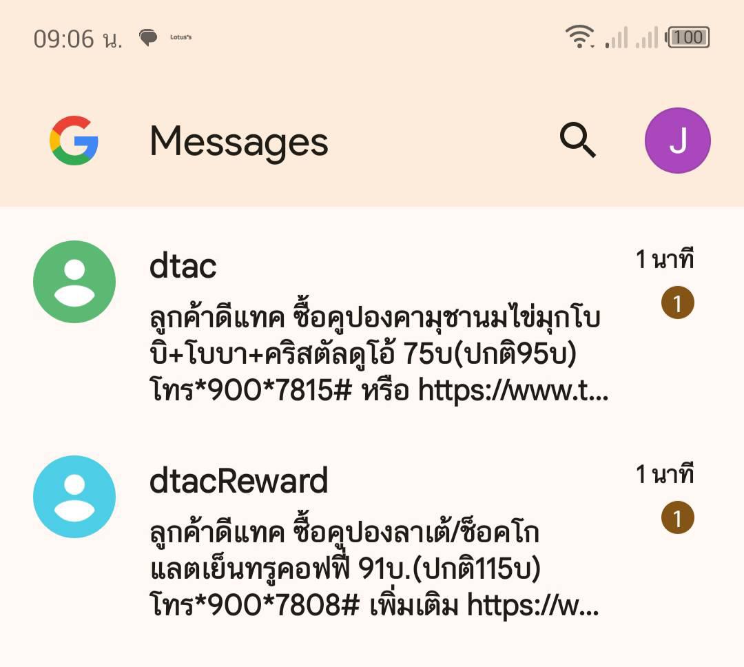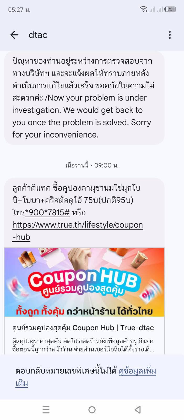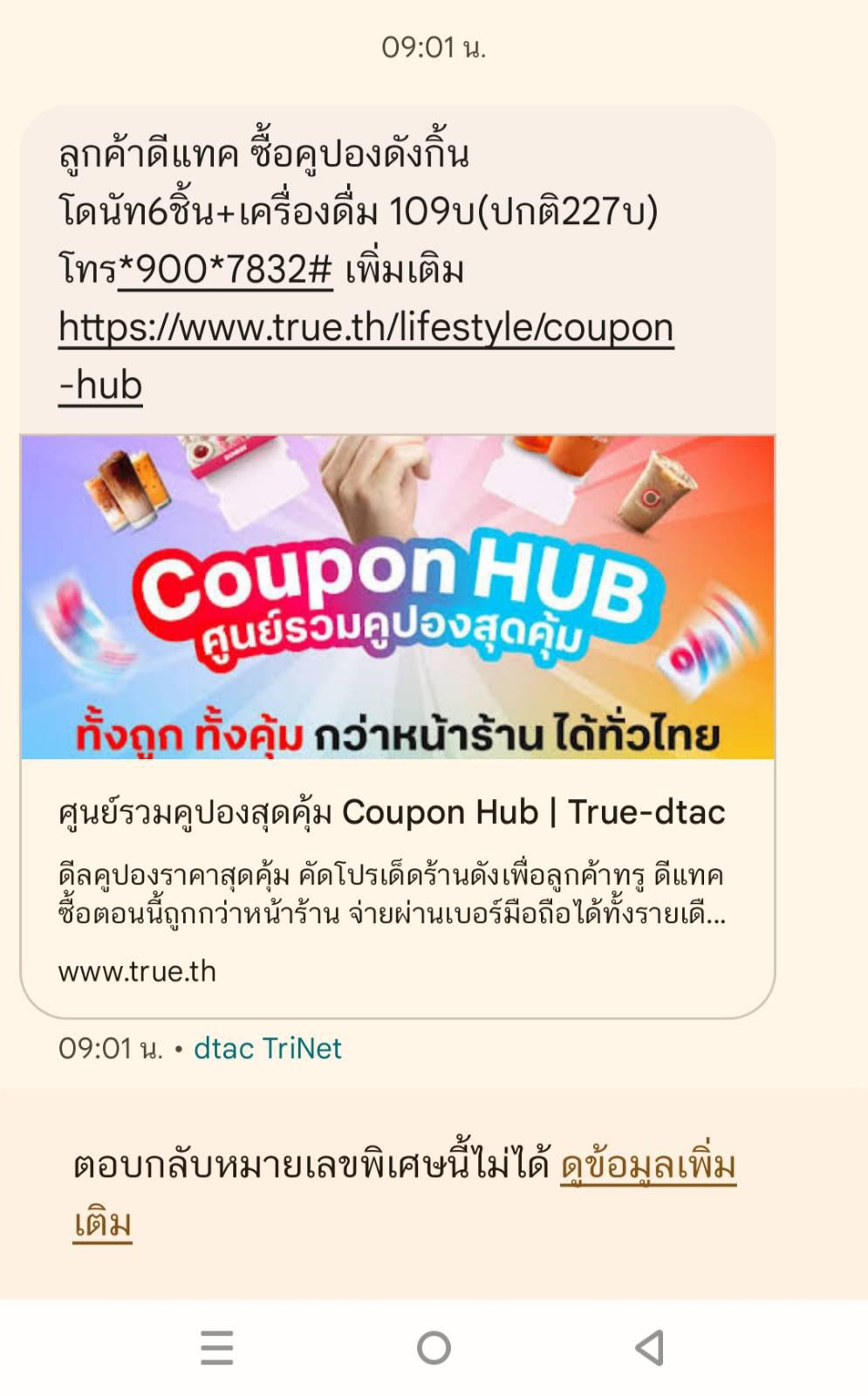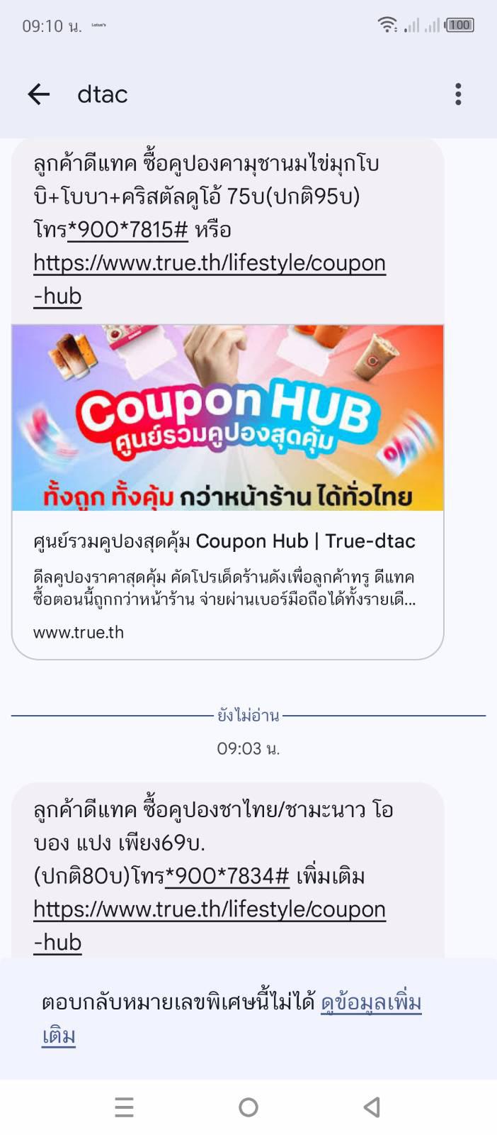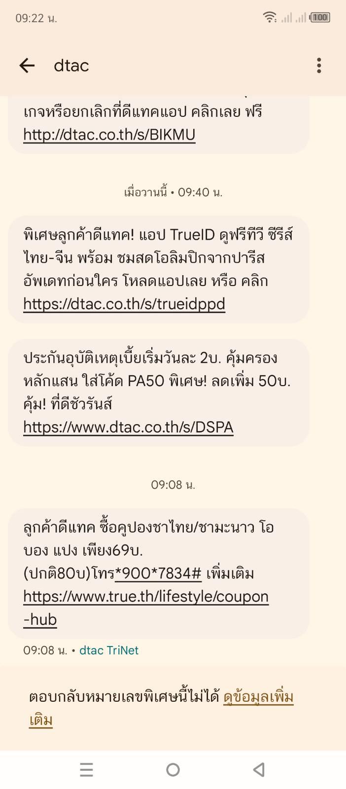 เช้านี้ เจอปัญหาSMS น่ารำคาญ ลองใช้ *137 เบอร์ฟรีระงับ SMS โฆษณา ก็ไม่ได้ผล SMS น่ารำคาญ เข้ามาต่อเนื่อง ตั้งแต่ 7 โมงกว่า จนถึง เวลาปัจจุบัน จึง โทรไป ศูนย์ Dtac 1678 จำนวน 2 รอบ เจ้าหน้าที่ Call cen