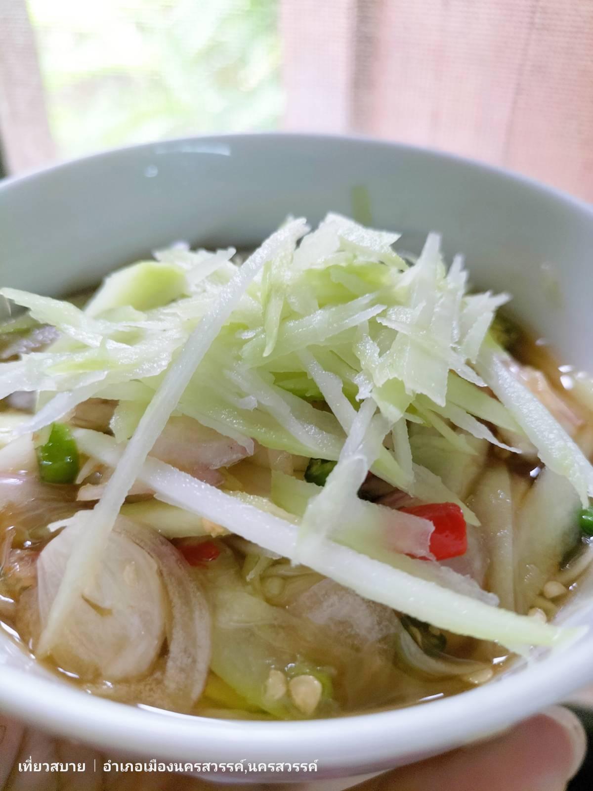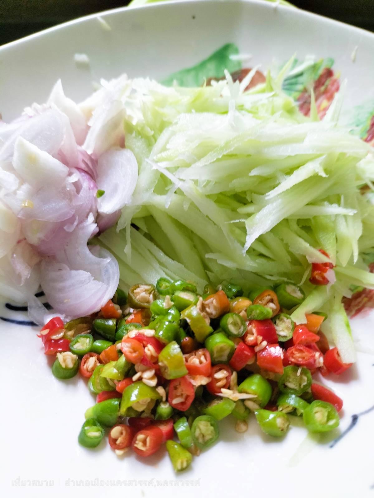 3.จากนั้นทำน้ำยำ ปอกมะม่วงเปรี้ยว สับให้เป็นเส้นๆ ซอยพริกให้เป็นชิ้นเล็กๆ