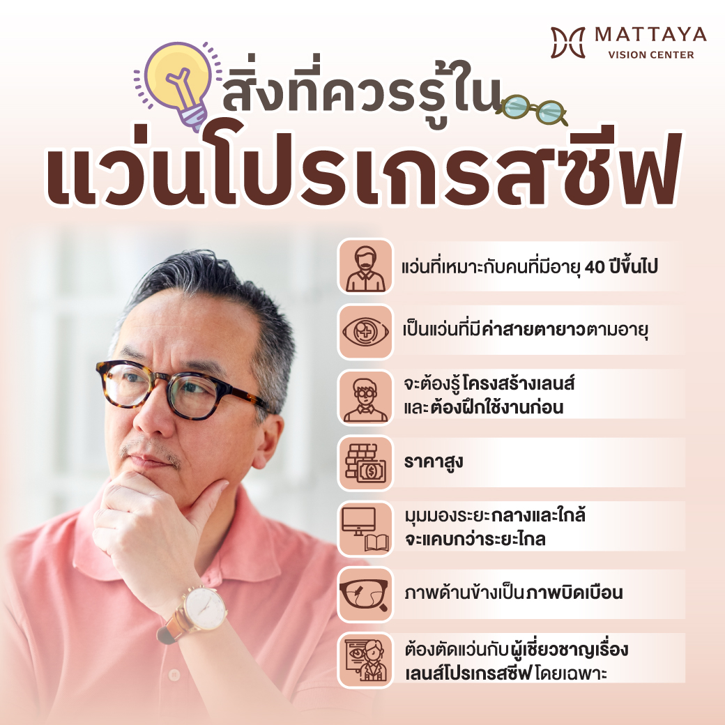 นี้คือข้อจำกัดของเลนส์โปรเกรสซีฟ โดยเราจะต้องรู้ข้อจำกัดของเลนส์ก่อนที่จะตัดสินใจซื้อ หากเรามีกิจกรรมที่ต้องมองระยะกลางและระยะใกล้ หรือทำงานระยะใกล้นานๆ แว่นโปรเกรสซีฟจะไม่เหมาะ เราอาจจะต้องเลือกเลนส์ชนิดอื่นในการใช้งานแทน แนะนำทดลองใส่ใช้งานเลนส์โปรเกรสซีฟที่ร้านแว่นที่มีเลนส์ให้เราได้ทดลองใส่ใช้งานก่อน ก่อนที่จะตัดสินใจซื้อเลนส์โปรเกรสซีฟจะช่วยให้เราตัดสินใจซื้อแว่นโปรเกรสซีฟได้ดีที่สุดค่ะ