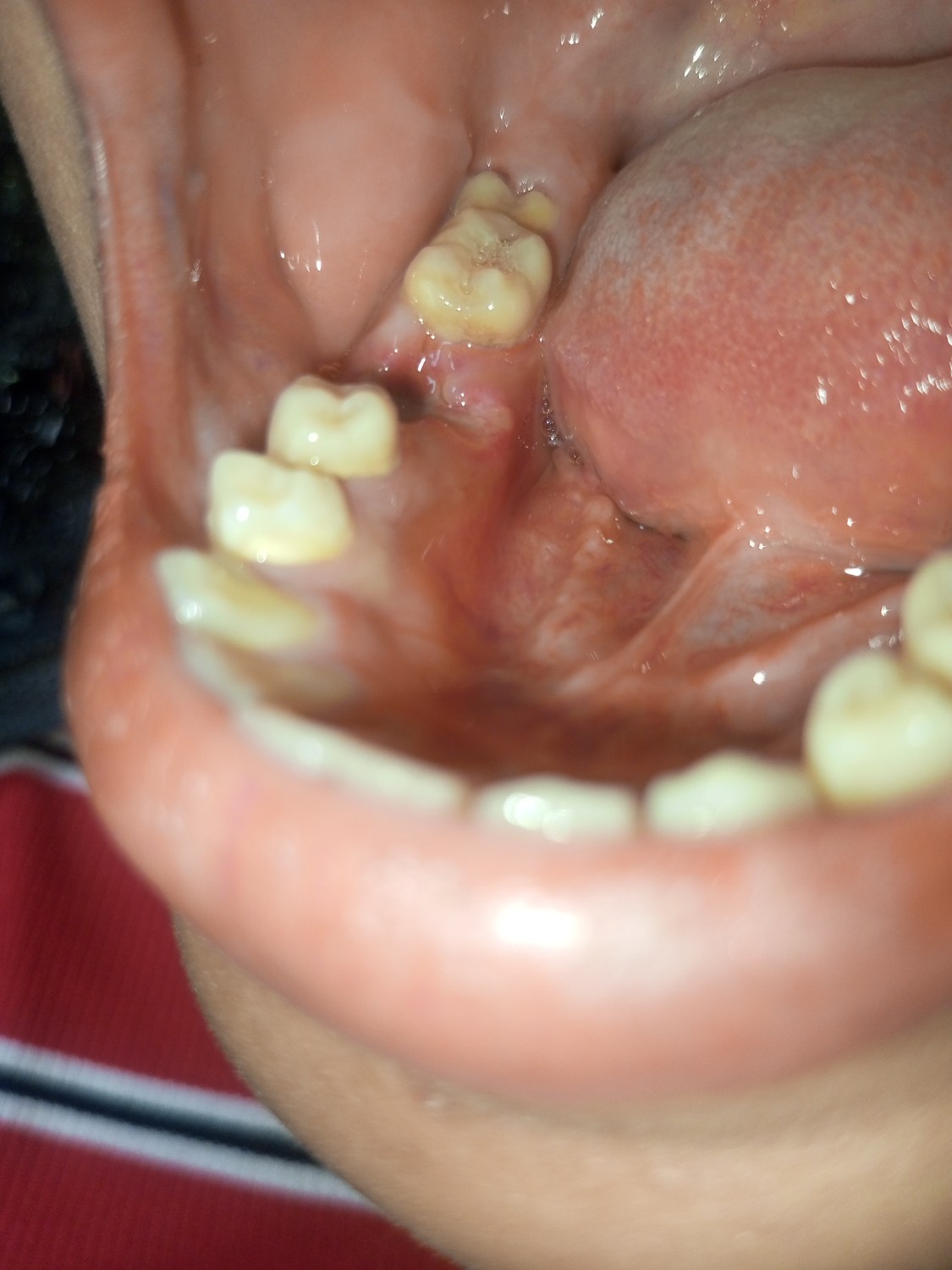 เคยมีฟันฝังอยู่ใต้ฟันน้ำนมแล้วถอนฟันน้ำนมออก แต่พอถอนฟันน้ำนมออกฟันฝังก็โผล่พ้นเหงือกออกมาแค่ปลาย แล้วก็ไม่ขึ้นอีกเลย ประมาณ 7 เดือนแล้ว ฟันซี่อื่นเป็นฟันแท้หมดแล้วค่ะ เหลือแต่ซี่นี้ขึ้นยังไม่ถึงครึ่ง