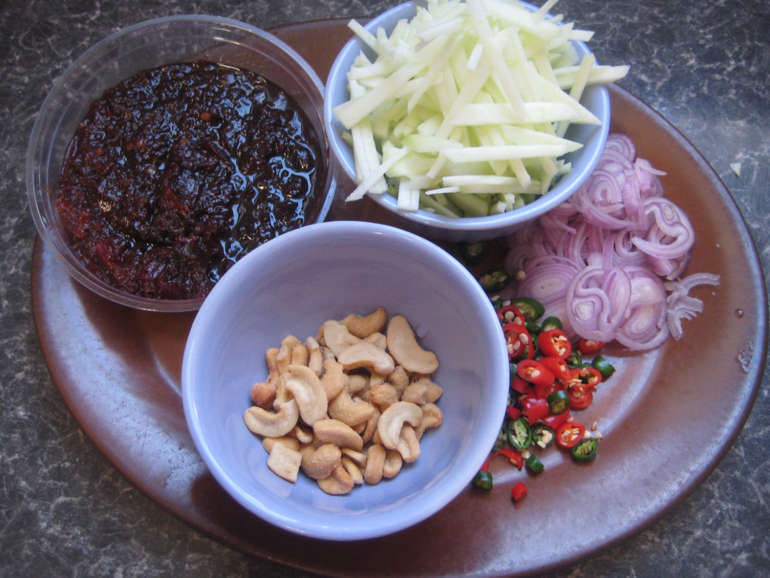 ส่วนผสม ปลาแซลมอน แอปเปิ้ลเขียว น้ำพริกเผา เม็ดมะม่วงหิมพานต์อบ พริกขี้หนู หอมแดง