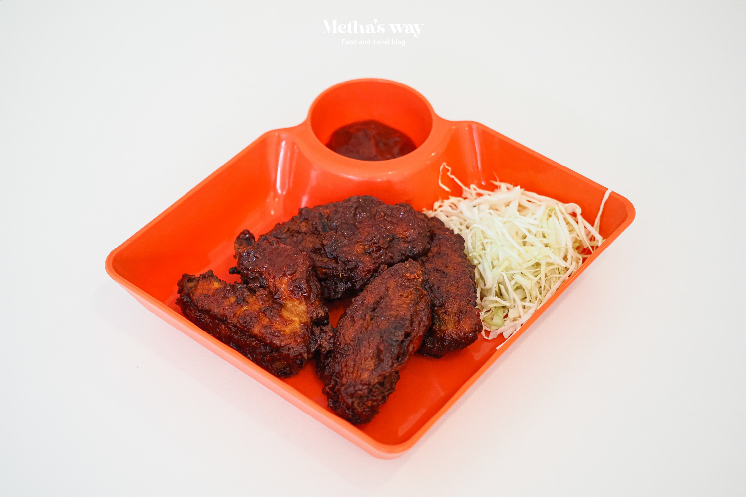 ปีกไก่ที่ถูกเคลือบมาด้วยซอสสูตรพิเศษของร้าน เห็นเคลือบมาแบบเข้มๆ นี่ไม่ได้เค็มเลยนะ แต่เป็นรสชาติเค็มอมเปรี้ยว คือมีความอมเปรี้ยวนิดๆ ทำให้การกินของทอดไม่เลี่ยนเลย