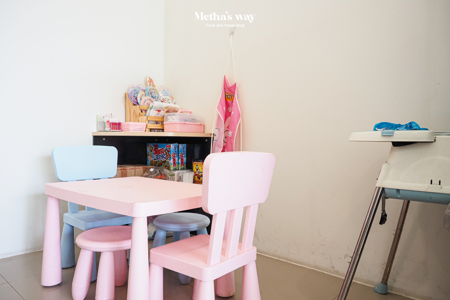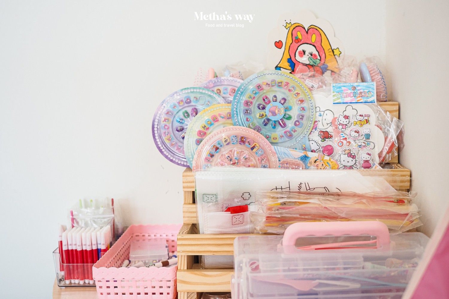 ถ้ามีลูกเล็กเด็กน้อยมาด้วยก็มีมุมให้ทำกิจกรรมด้วย ส่วนใหญ่เป็นเกี่ยวกับศิลปะ ให้น้องๆ ได้ฝึกสมาธิค่ะ
