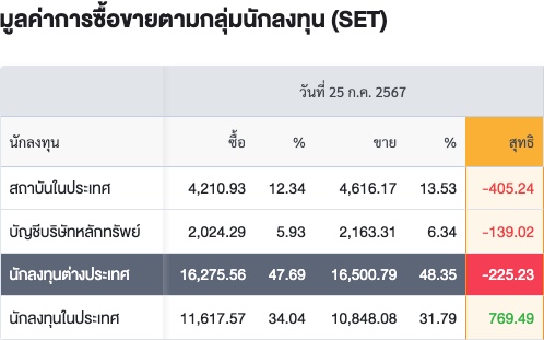 Sinthorn Summary 25/7/2567 : ต่างชาติซื้อสุทธิ -225.23 ลบ.