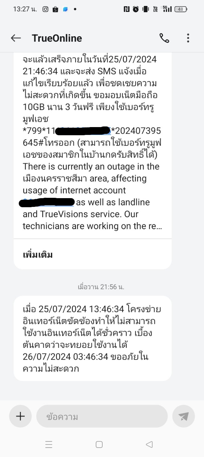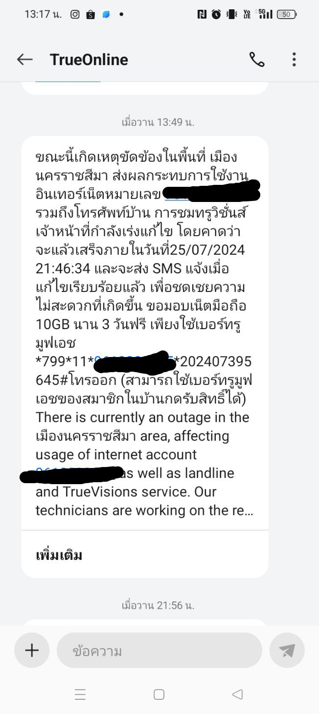 ใช้อินเตอร์เน็ตบ้าน บวกกับดูทีวี แต่ระบบขัดข้องบ่อยมาก และขัดข้องนาน ไม่สามารถใช้เน็ตในการทำงานในชีวิตประจำวันได้ ล่าสุดขัดข้องตั้งแต่เมื่อวาน13/7/67 6:00 น. และบอกว่าจะใช้ได้วันที