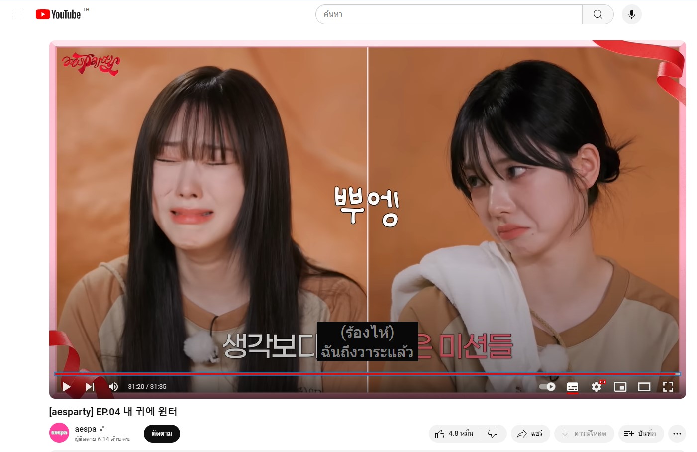 เราอยากเห็นฉากที่ทั้ง Karina กับ Giselle ร้องไห้อยู่ในห้องซาวน่า ไม่แน่ใจว่าทั้งสองคนเป็นไรกัน แต่ดูยังไงก็ไม่เจอ หรือเรากดข้ามอะไรไปรึป่าวคะ ใครพอจะทราบว่า อยู่ EP ไหน ช่วงนาที ที่เท่าไหร่คะ อยากรู้ว่าร้องไห้กันทำไม5555