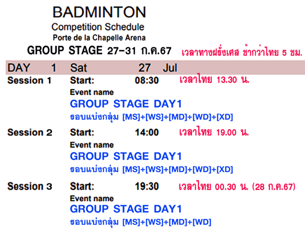 เชียร์สด ! แบดมินตัน PARIS OLYMPIC GAMES 2024 : รอบแบ่งกลุ่ม Day 1 (27 ก.ค. 67) (คู่แรก 13.30 น.)
