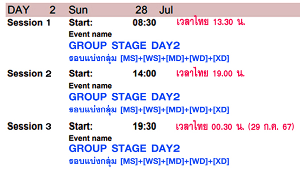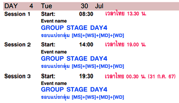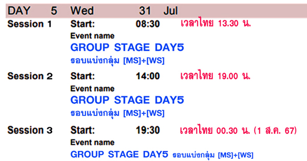 • Match Schedule : Group Stage รอบแบ่งกลุ่ม (27 - 31 ก.ค. 67)