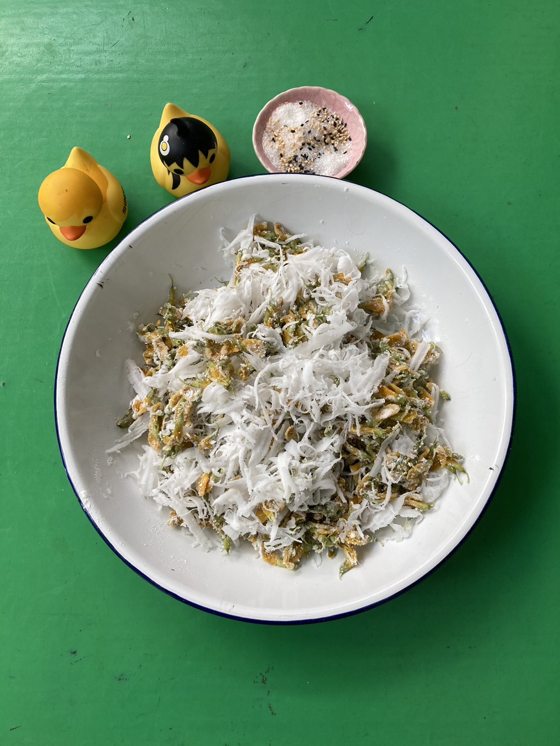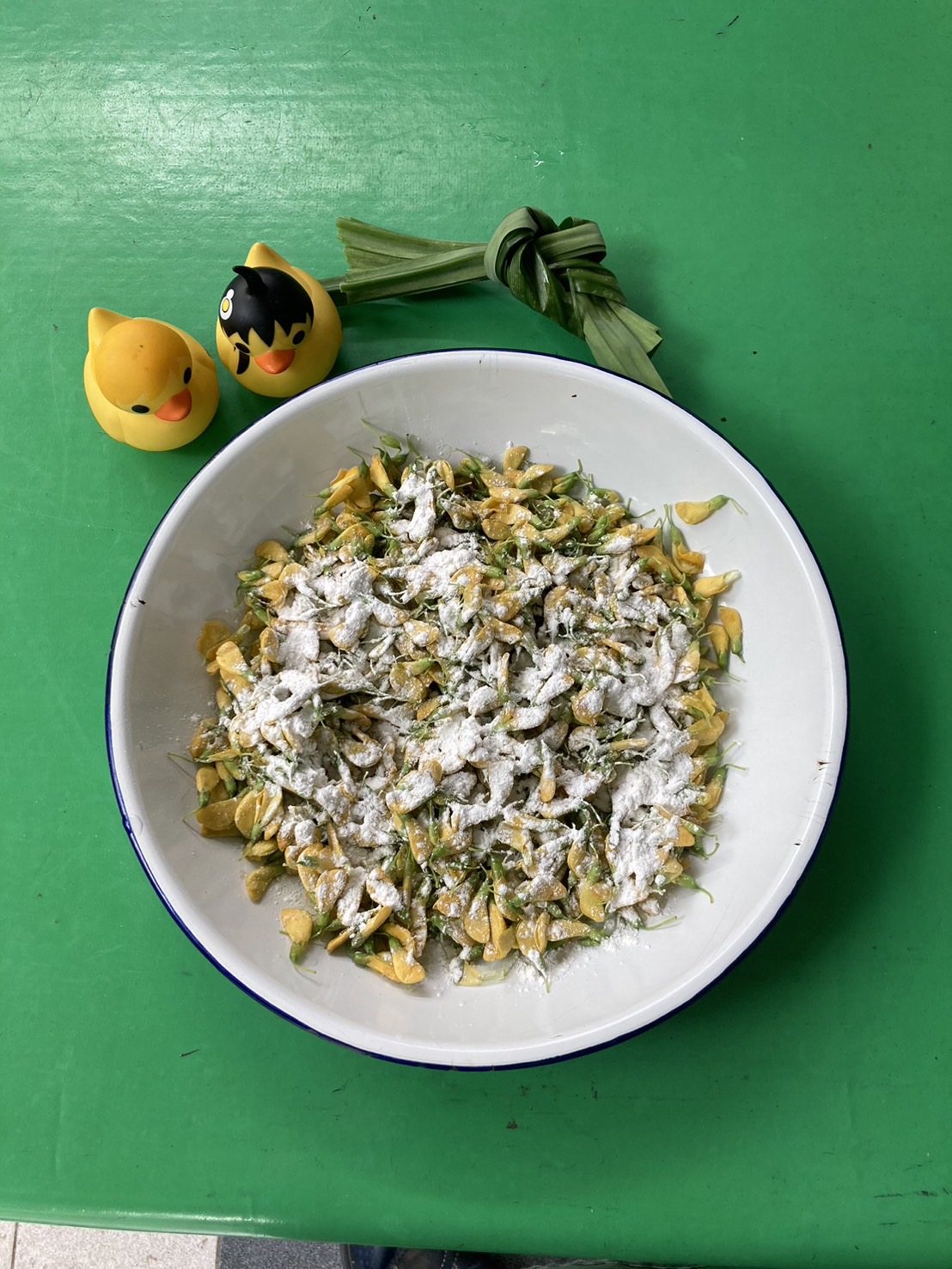 ส่วนผสมไม่มีนะคะ กะๆเอาค่ะ ดอกโสนโรยเกลือแล้ว นำแป้งข้าวเจ้ามาคลุกให้ทั่วค่ะ ก่อนจะนึ่งขนมดอกโสน ต้องตั้งน้ำให้เดือดก่อนนะคะ