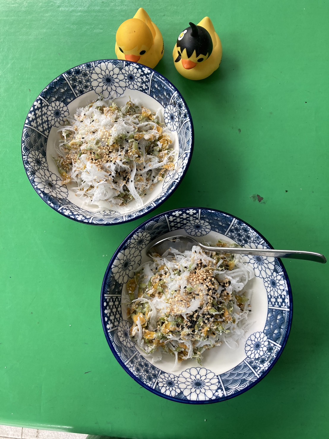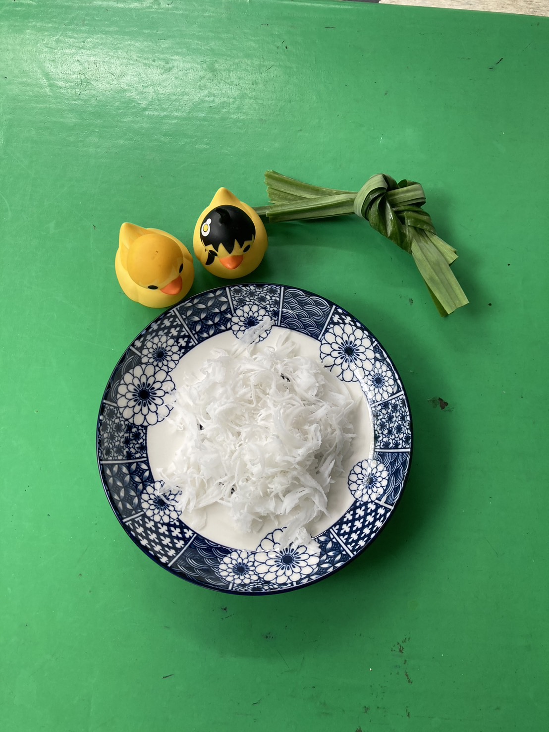 มะพร้าวขูดแล้ว นำไปนึ่งโรยเกลือนิดหน่อย กันมะพร้าวเสีย แต่ไม่ทันได้เสียค่ะ นึ่งออกมาปุ๊บพอหายร้อน 2 คนซัดเกลี้ยงทันที