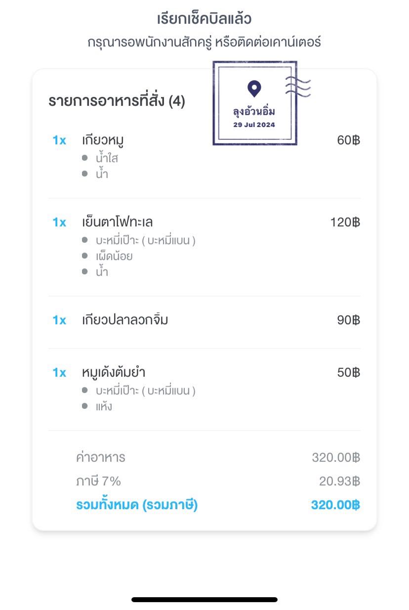 วันเสาร์ที่ 29 พฤศจิกายน พ.ศ. 2568 - GMT+07:00 🕒 13:24 น. 📌 เอ็มเค เซ็นทรัลพลาซ่าชลบุรี 💵 1,412 บาท หมูกรอบ หมูแดง แยกน้ำราด เป็ดย่าง MK แยกน้ำราด ตีนห่าน ซาลาเปาไส้ครีม ซาลาเปาไ