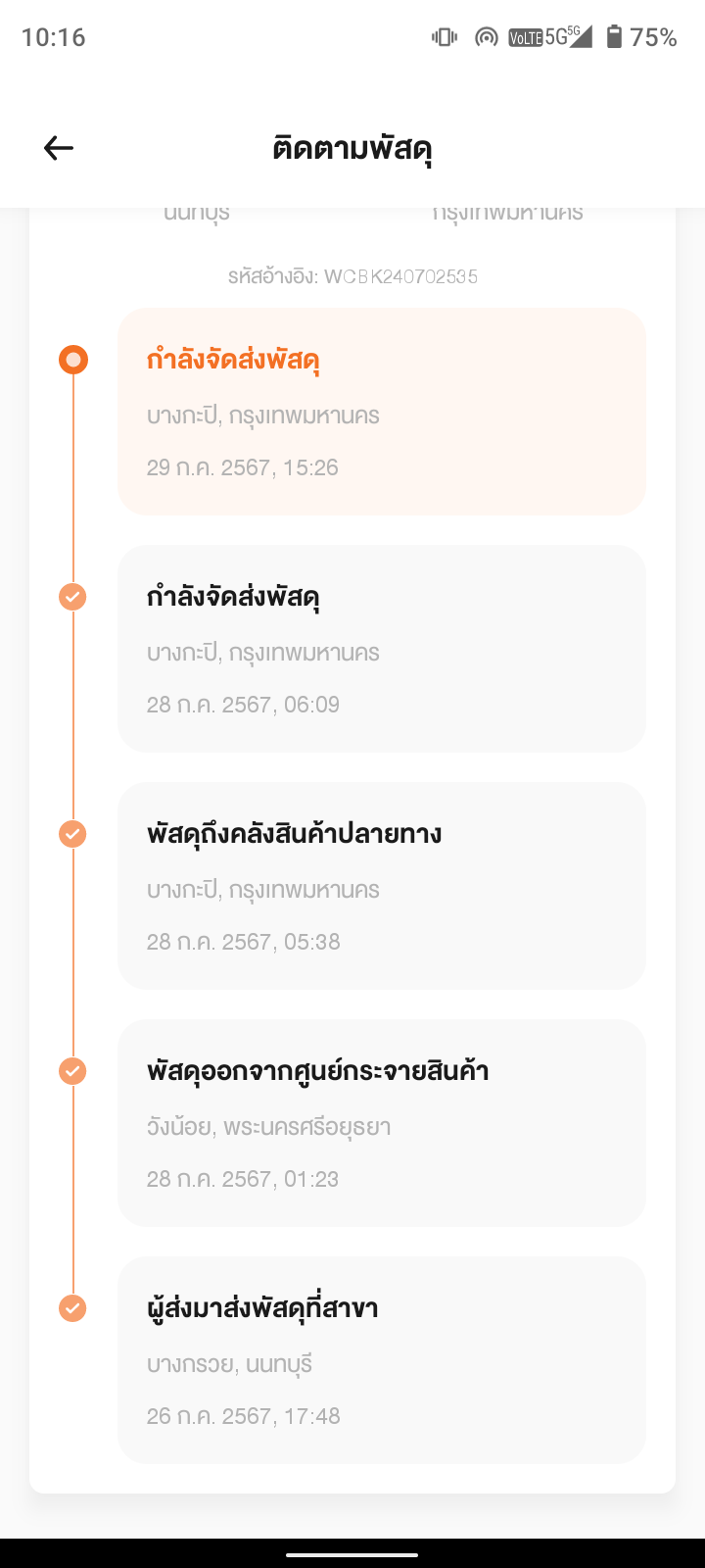 ส่งของวันที่9/11/68 ควรจะถึงภายในวันที่11/11/68 เนื่องจากส่งภายในกรุงเทพจากมีนบุรีไปยังเขตราชเทวี วันนี้วันที่12/11/6ไม่มีความคืบหน้าอะไรเลย และได้รับการตอบกลับว่าหาพัสดุไม่พบ มีการอ้างว่าข้อมูลลงระบบ