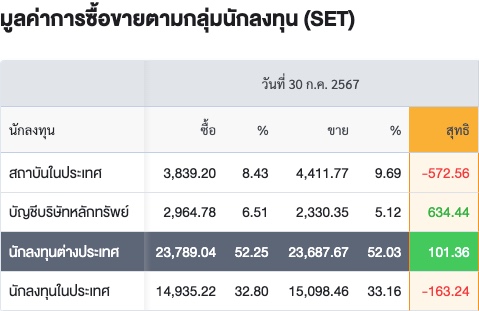 Sinthorn Summary 30/7/2567 : ต่างชาติซื้อสุทธิ 101.36 ลบ.
