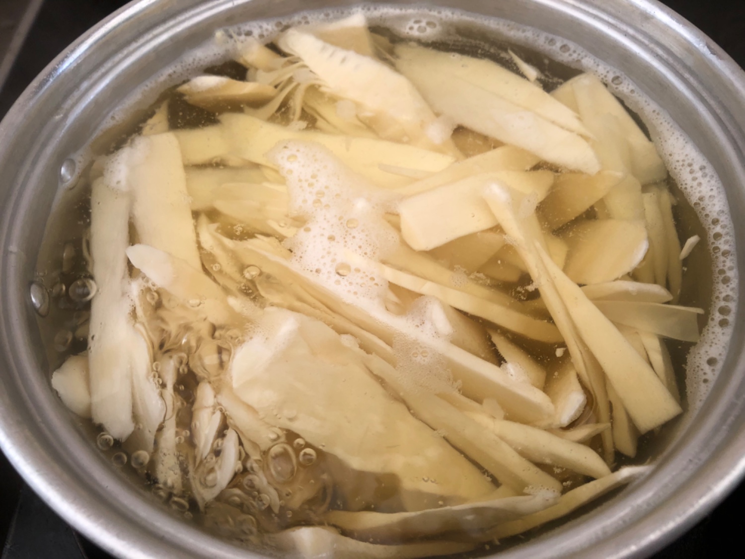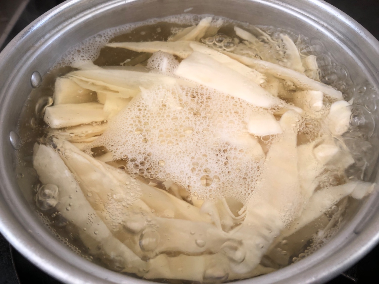 ต้มหน่อไม้ ใส่เกลือ เดือดแล้วเทน้ำทิ้ง ต้มอีกรอบเดือดแล้วเททิ้งแช่น้ำเย็นไว้ค่ะ เหลือก็แช่น้ำใส่ตู้เย็น ยิ่งกรอบอร่อย 😊