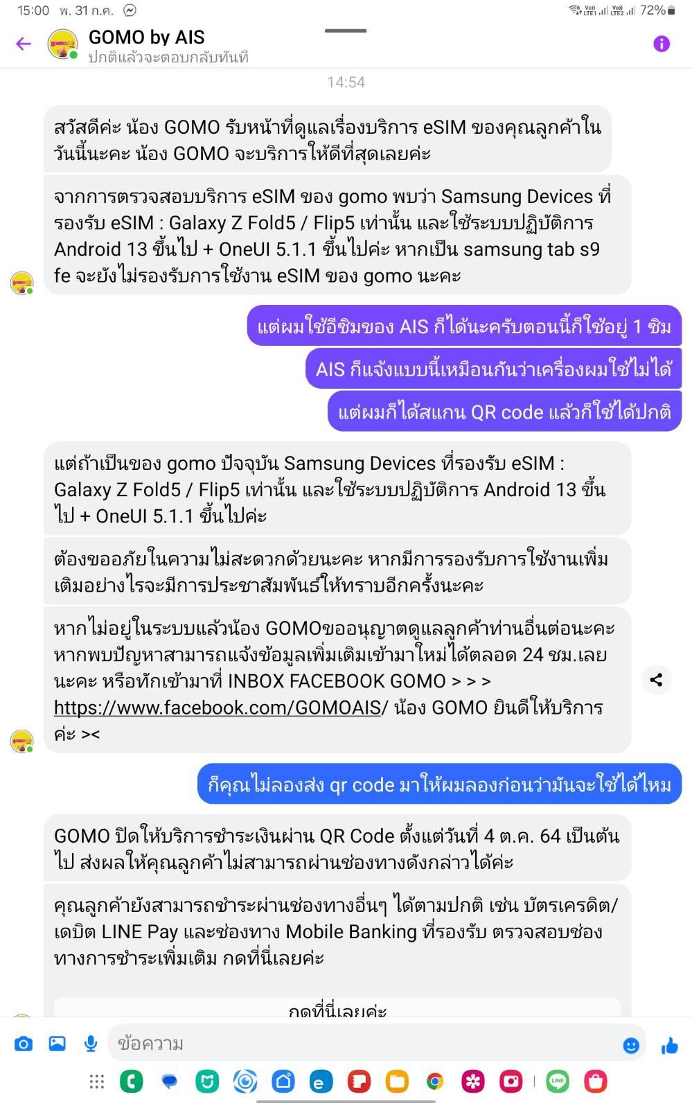 ผมจะสมัครใช้ esim ของ gomo แล้วไม่มีศูนย์บริการที่ทำได้ ถ้าเป็นไอโฟนจะทำผ่านตัวเครื่องได้เลย แต่ซัมซุงต้องสแกนจาก qr code เอาเอง ผมใช้ samsung tab s9 fe