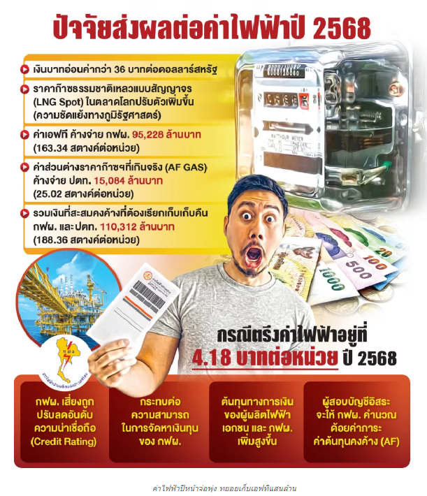ส่วนที่ว่าจะสามารถยืนอัตราค่าไฟอยู่ที่ 4.18 บาทต่อหน่วย ได้ตลอดทั้งปี 2568 หรือไม่ ต้องเรียนว่าถือเป็นตัวเลขที่ดี เพราะในความคิดเห็นส่วนตัวก็ต้องการให้เป็นแบบนั้น และหากมีราคาก๊าซที่ถูกลง ก็อาจจะเห็นแนวโน้มค่าไฟที่สามารถยืนระดับค่าไฟอยู่ในระดับ 4.18 บาทต่อหน่วยหรือลดลงได้ แต่การพิจารณาต้องดูปัจจัยต่างๆ ประกอบการตัดสินใจ โดยเฉพาะความเหมาะสมในการชำระหนี้คืนให้กับกฟผ. และปตท. ซึ่งยอมรับว่า กฟผ.ช่วยแบกรับภาระส่วนนี้ให้กับประชาชนไว้ระดับหนึ่งแล้ว ย่อมส่งผลกระทบต่อการจัดอันดับความน่าเชื่อถือ (Credit Rating) ของ กฟผ. ด้วย