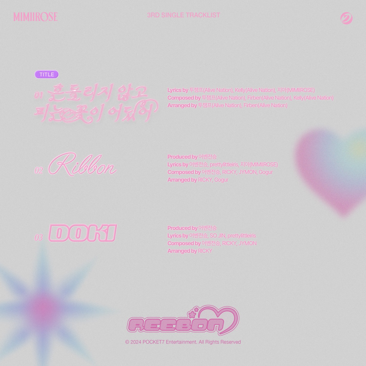 MIMIIROSE(미미로즈) 3RD SINGLE ALBUM ‘REEBON’ 2024.08.16 Highlight Medley1 흔들리지 않고 피는 꽃이 어딨어 title2. Ribbon3. Dokihttps://www.youtube.com/watch?v=ZFs_xxhRyD