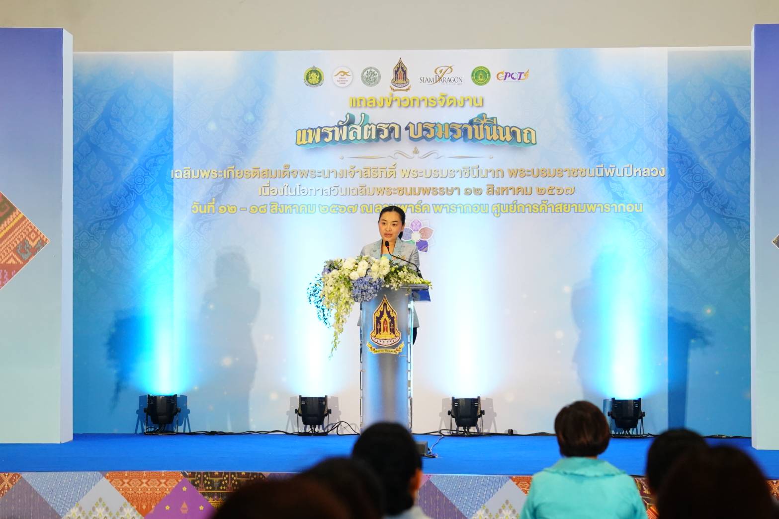 นางมยุรี ชัยพรหมประสิทธิ์ กรรมการผู้จัดการใหญ่ สายองค์กรสัมพันธ์และสื่อสารองค์กร บริษัท สยามพิวรรธน์ จำกัด กล่าวว่า กลุ่มบริษัทสยามพิวรรธน์ และศูนย์การค้าสยามพารากอน มีความยินดีเป็นอย่างยิ่งที่ได้ร่วมกับกระทรวงวัฒนธรรมและหน่วยงานต่างๆ จัดงาน “แพรพัสตรา บรมราชินีนาถ” เพื่อเฉลิมพระเกียรติสมเด็จพระนางเจ้าสิริกิติ์ พระบรมราชินีนาถ พระบรมราชชนนีพันปีหลวง และน้อมสำนึกในพระมหากรุณาธิคุณที่ทรงปฏิบัติพระราชกรณียกิจนานัปการเพื่อประโยชน์สุขของพสกนิกรชาวไทย ซึ่งการสนับสนุนการจัดงานครั้งนี้ เพื่อส่งเสริมให้ประชาชนชาวไทยได้เรียนรู้พระราชประวัติ พระราชกรณียกิจของสมเด็จพระนางเจ้าสิริกิติ์ พระบรมราชินีนาถ พระบรมราชชนนีพันปีหลวง โดยเฉพาะด้านการอนุรักษ์ พัฒนาและต่อยอด “ผ้าไทย” นับเป็นการส่งเสริมงานหัตถศิลป์และงานหัตถกรรมของไทย และร่วมสืบสาน รักษาและต่อยอดมรดกทางศิลปวัฒนธรรมของชาติให้คงอยู่อย่างยั่งยืน ซึ่งกลุ่มบริษัทสยามพิวรรธน์ให้ความสำคัญและยึดมั่นในการสนับสนุนงานหัตถศิลป์และงานหัตถกรรมของไทยมาโดยตลอด จึงได้เปิดพื้นที่เพื่อสนับสนุนงานภูมิปัญญาไทยและส่งเสริมช่างฝีมือไทยนำเสนอผลงานอันทรงคุณค่าสู่สาธารณชนทั้งคนไทยและชาวต่างชาติทั่วโลก