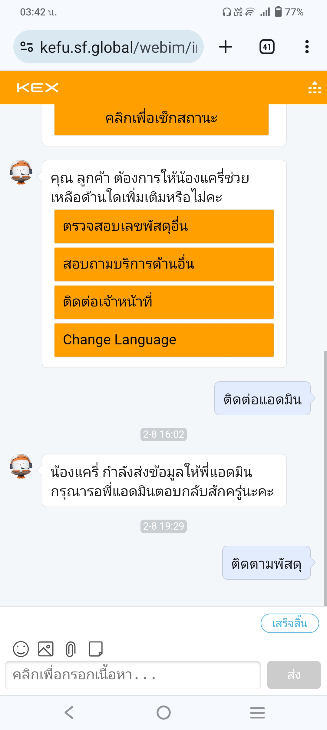 KEX ทำไมขึ้นแบบนี้ เลย 24ชั่วโมงแล้ว สอลถามไปก็มีแต่ขออภัย ไม่รู้ว่าของถึงไกน กลัวของกินจะเน่าเสีย ใหเผู้ส่งยกเลิก?