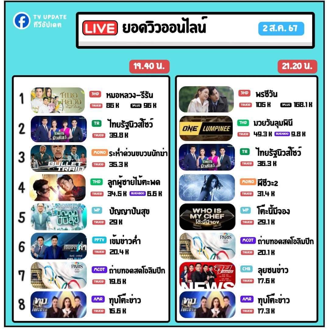 ยอดวิวออนไลน์ 2 ส.ค.2567 โดยทีวีอัปเดต