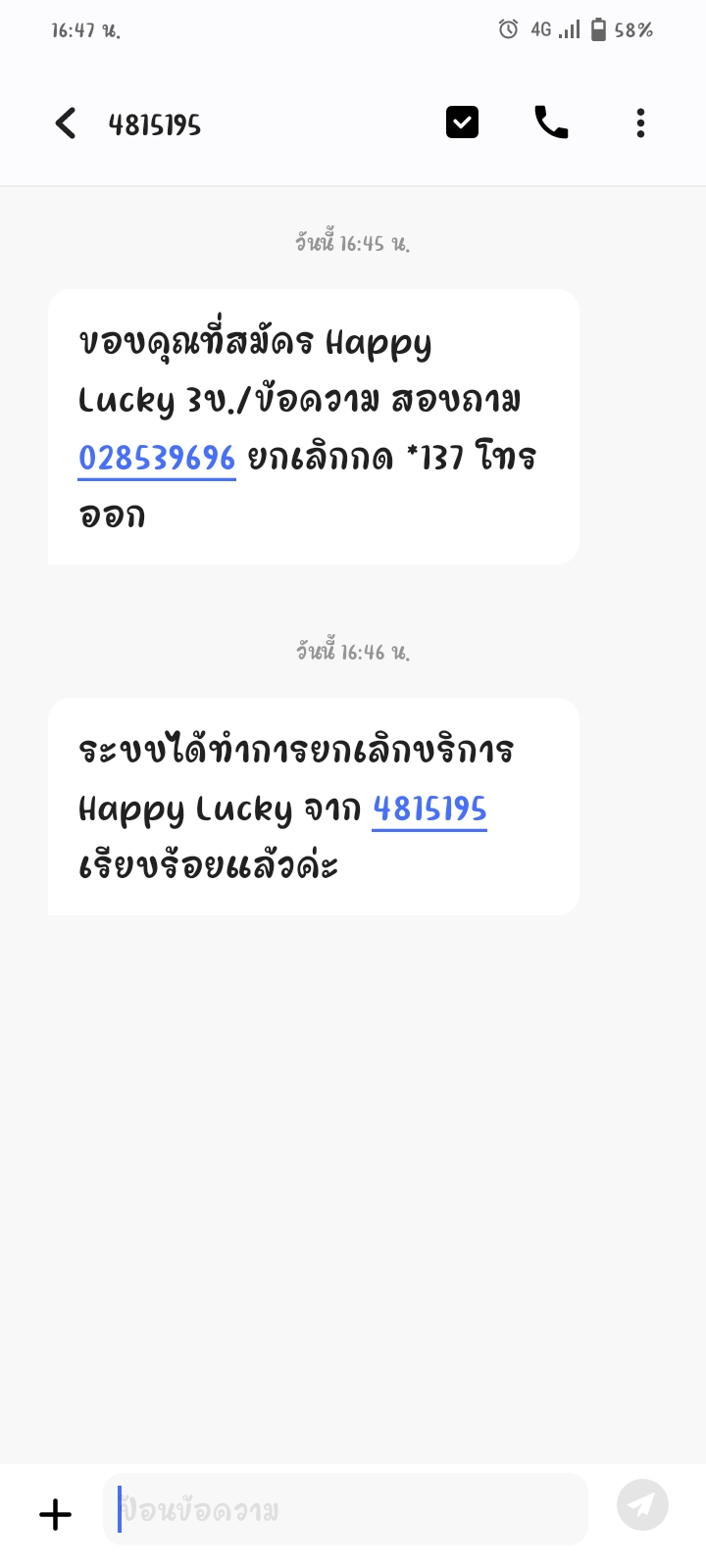 คืนนี้ผมได้รับ SMS จากเบอร์ 4239243 ข้อความว่า “ขอบคุณที่สมัคร Horo Lucky D2 5 บาท/ข้อความ” ผมอยากถามตรง ๆ ครับ ว่า ผมไปสมัครตอนไหน? เพราะความจริงคือ ผมไม่เคยกดสมัครเอง ผมไม่เคยกดยินยอม แล
