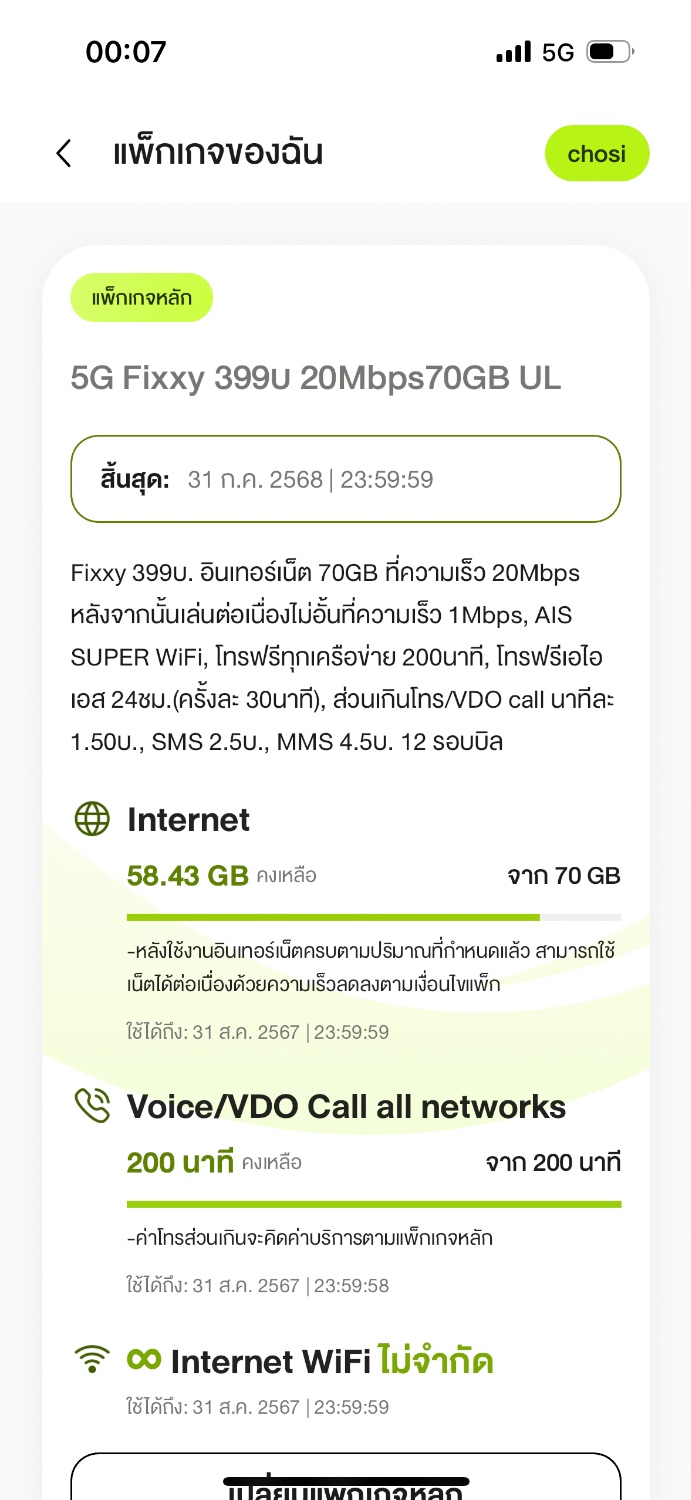 อยากสอบถามหน่อยครับว่า โปรรายเดือน5G Fixxy Speed ค่าบริการ 399 บาท โทรในเครือข่าย AIS ไม่จำกัด (ครั้งละ30นาที) นอกเครือข่าย 150 นาที เน็ต 5G ความเร็ว สูงสุด 5GB จากนั้น 10Mbps, ส่วนเกินโทร/VDO call นา