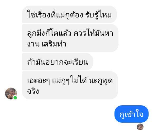 คุยไปคุยมา ผมเองก็ผิดนะ ยอมรับว่าตัวผมเองก็ร้อนใจเรื่องมอเตอร์ไซค์อีกคัน ที่ไฟแนนซ์เค้าให้โอกาสอีก2เดือนจะมายึด เลยปากพล่อยไป บอกมันว่าถามอา(ก็แม่มันเร่ะ แต่ผมเรียกอา) หน่อยได้มั้ยว่าพอมีซัก5พันมั้ยขอยืมก่อนเอามาจ่ายค่าไฟแนนซ์มอเตอร์ไซค์แล้วจะผ่อนคืนให้เดือนละพันตอนนี้มีมือถือแล้วจะผ่อนโอนเงินในแอฟให้ เพราะถึงแม้ผมตกงานแต่เมียยังทำอยู่ จะไปกู้เงินเสียดอกร้อยละ20 ก็ดอกเบี้ยท่วมต้นเลยเคยคิดเลขดูแล้วหนักกว่า5พันสองเท่า