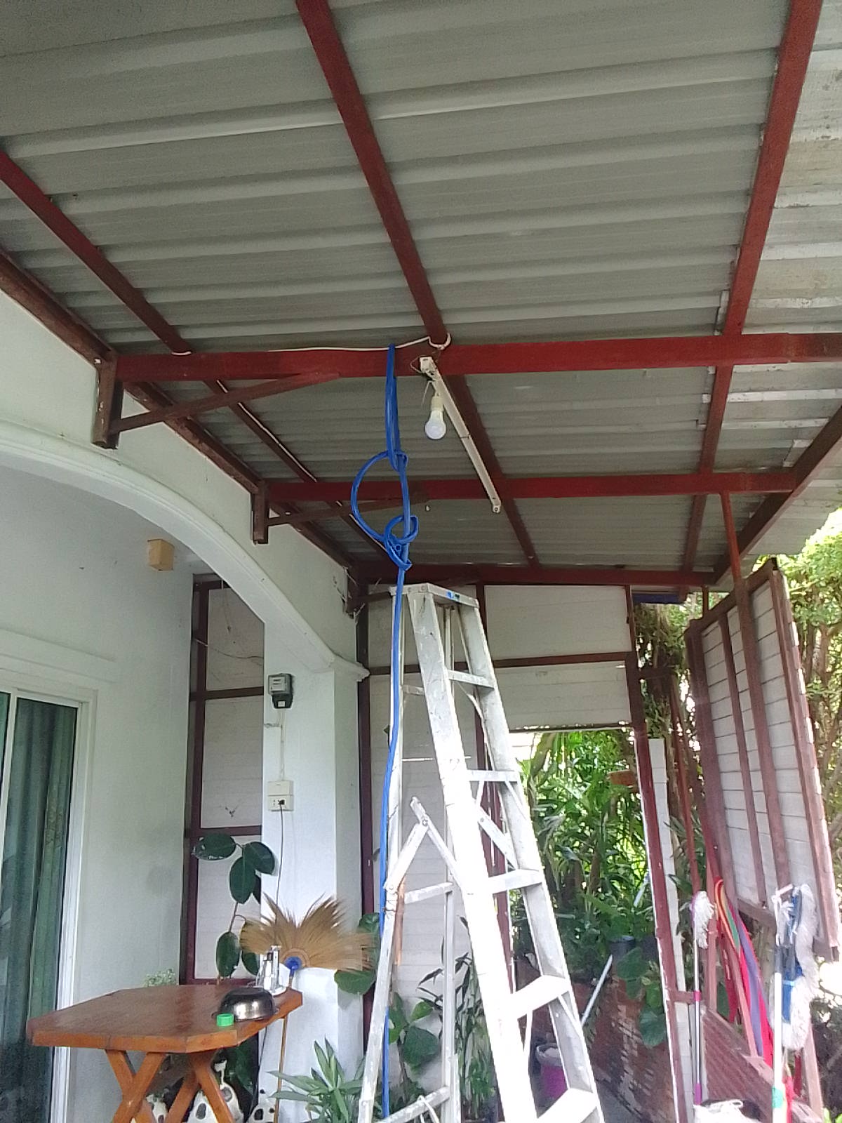 พอกลับมาที่นอนเลยเอาสายยางที่ผมรดน้ำต้นไม้มาคล้องคานเหล็ก