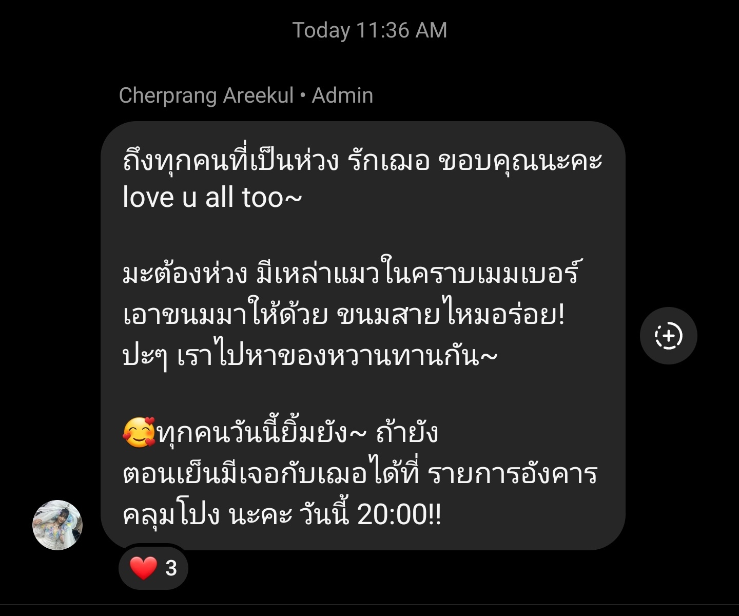 เป็นกำลังใจให้นะ BNK48! ขอบคุณสำหรับทุกอย่าง เป็นพื้นที่ให้ได้เจออะไรเยอะมากจริงๆ ที่สำคัญคือได้เจอผู้คนที่รักและเอ็นดูเราเยอะมากๆ ขอบคุณที่พาพวกเขามาเจอกัน ไม่ว่าจะเบื้องหน้าเบื้องหลัง เมมเบอร์รุ่นไห