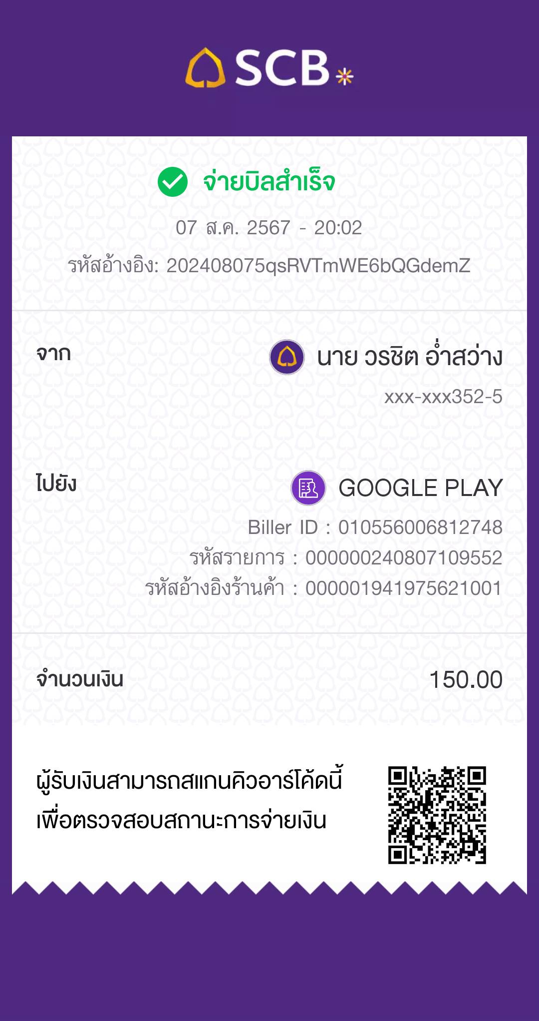ชำระเงินผ่านธนาคารกรุงไทยพร้อมเพเติมเกมส์เป็นสแกนไปแล้วแต่ของไม่เข้า