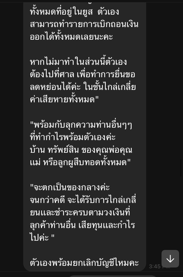 คือตอนเเรกเราแค่อยากลองทำเล่นๆดูเราเลยทักเค้าไป เค้ามให้เราเปิดบับัชญี100เราเปิดเสร็จก็นึกว่ามีแค่นี้เราเลยจะหยุดเค้าบอกว่าต้องโอนอีก100พอเราบอกไม่มีเค้าก็ให้เรานกเลิก1000เราถามว่ามีค่าอะไรอีกมั้ยเค้าบอกว่าไม่มีแต่ถ้าเราไม่ทำเร้าก็บอกจะฟ้องเราเลยโอน1000ไปเค้าก็บอกว่าต้องโอนอีก999 เราน้องทำยังไงกับแชทเค้าดีคะ ขอมูล เรามีแค่ชื่อจริง